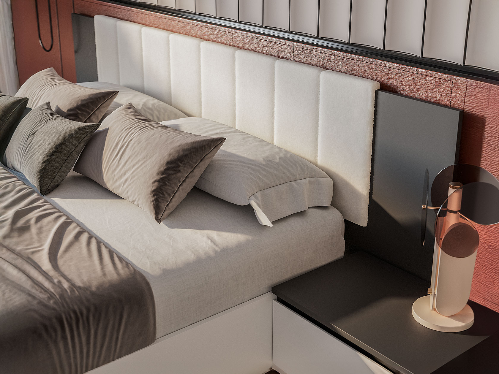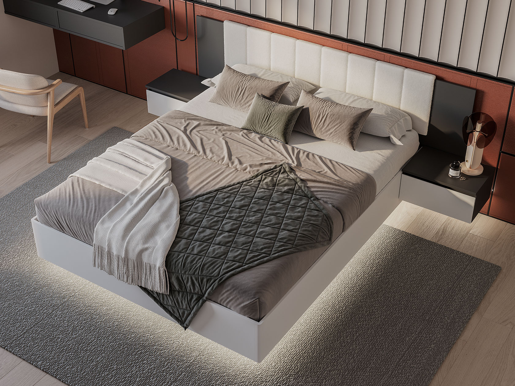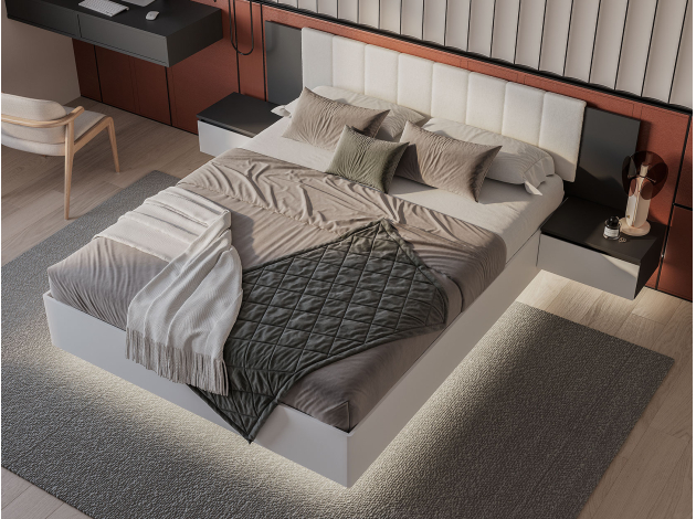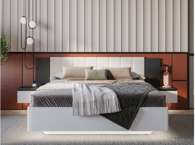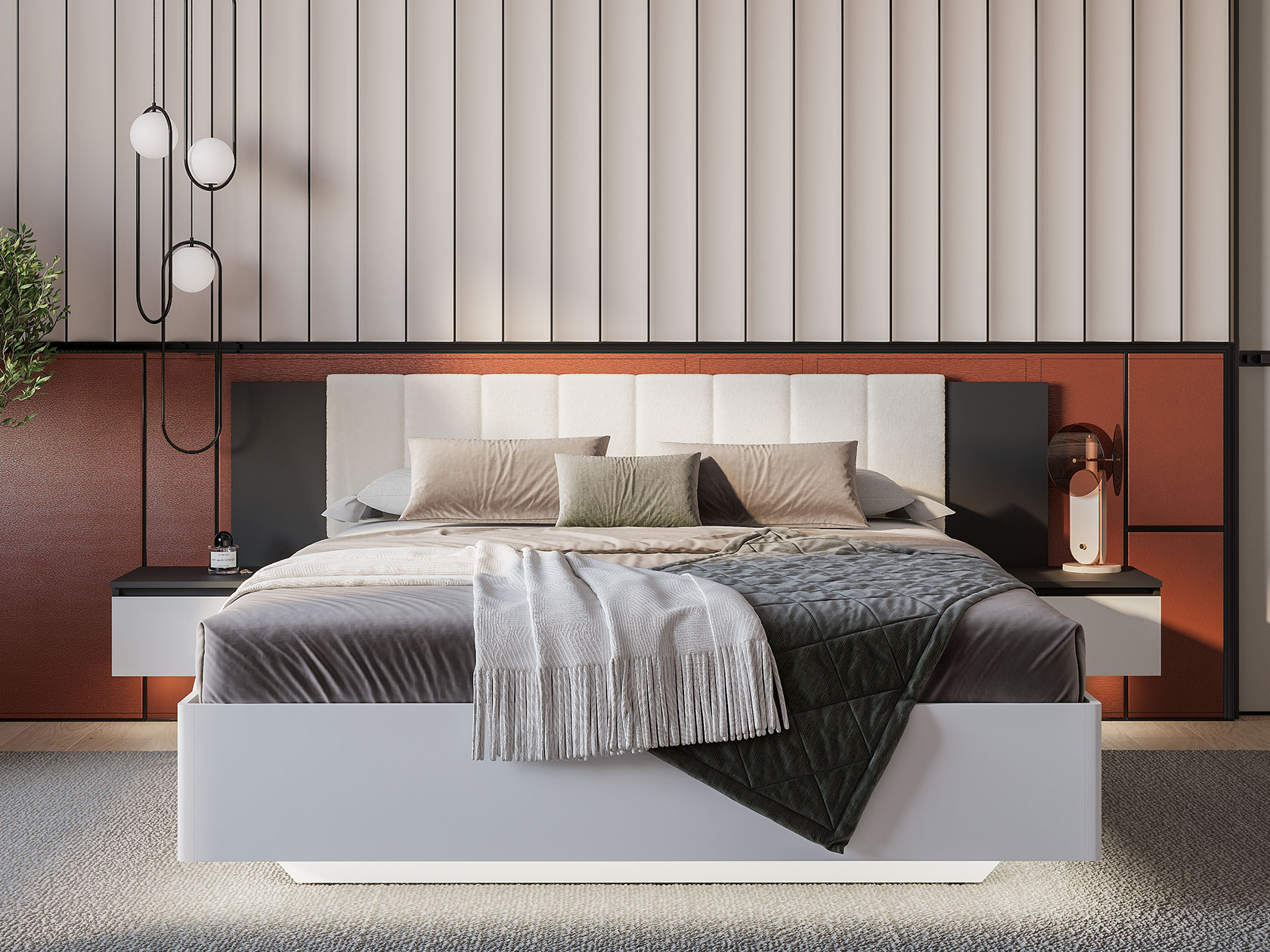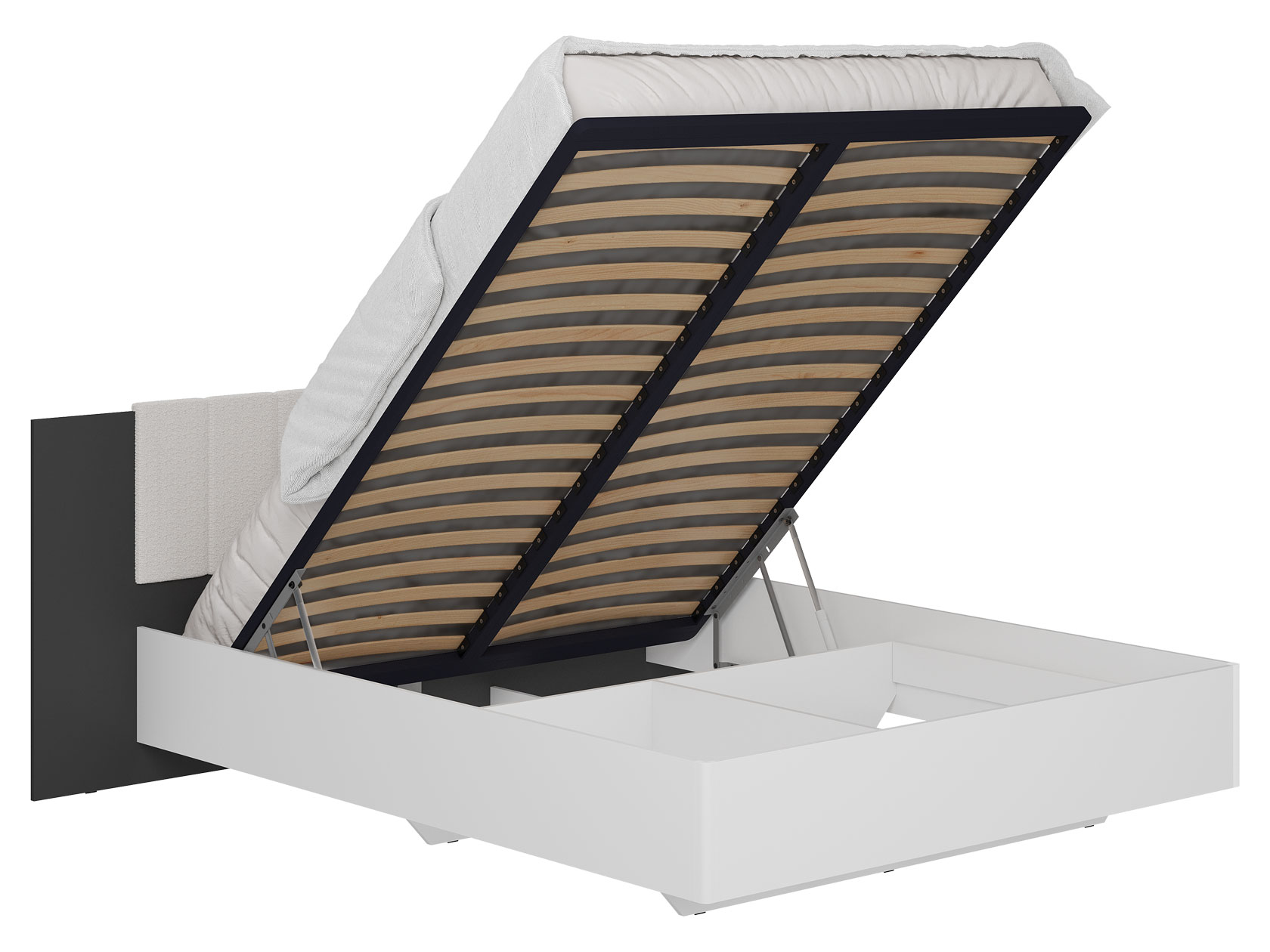 Кровать с подъемным механизмом Нуар ПМ запоминается необычным дизайном и отличается функциональностью. «Парящее» над полом основание создает эффект свободного пространства. Мягкое изголовье из фактурной ткани послужит опорой, чтобы отдохнуть и расслабиться за чтением. Подъемный механизм позволяет быстро достать вещи, которые хранятся в просторном бельевом коробе.