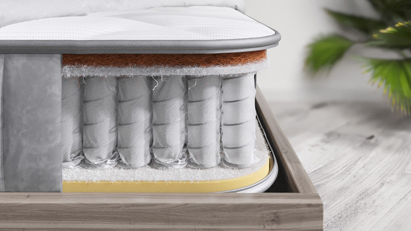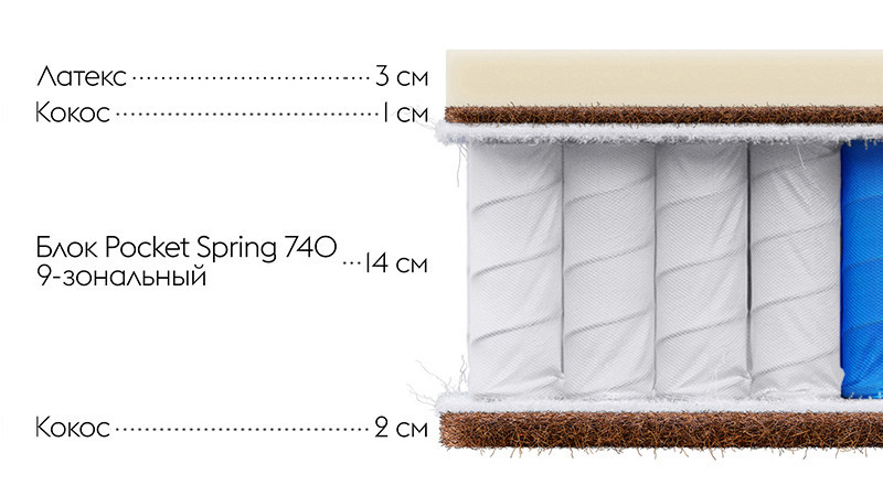 Более жесткая сторона дополнена слоем кокоса — натуральным наполнителем, который усиливает ортопедический эффект матраса. С другой стороны расположен латекс с тонкой прослойкой из кокосовой койры. Такое сочетание наполнителей делает поверхность более мягкой, подстраивается под особенности анатомии и нежно обволакивает тело, даря непревзойденное ощущение комфорта.