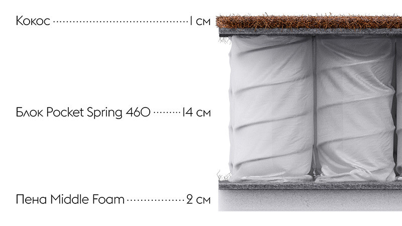Кокос придает одной из сторон необходимую жесткость, обеспечивает прочность и долгий срок службы пружинного блока. Слой пены смягчает поверхность другой стороны, способствует комфортному расслаблению.