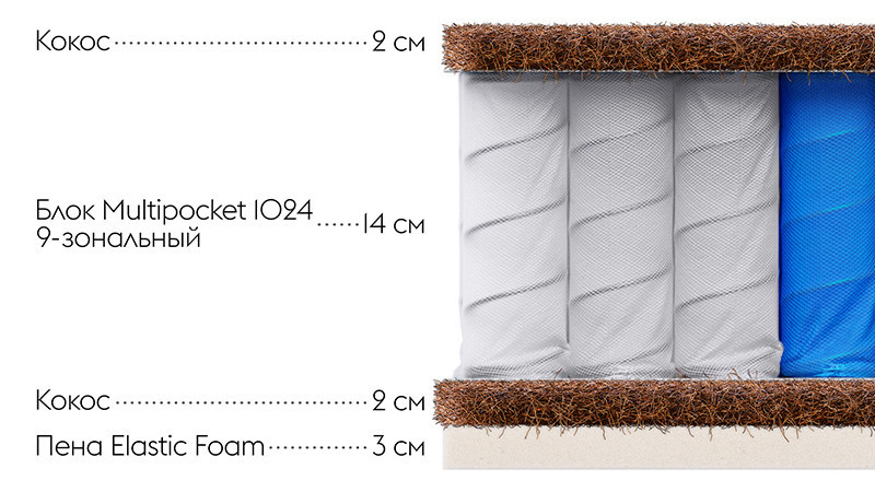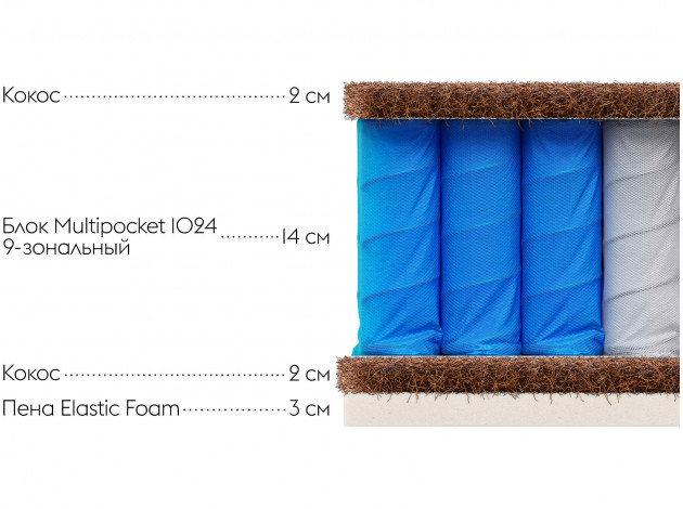 Слой упругой пены смягчает поверхность одной из сторон матраса. Наполнитель точечно подстраивается под контуры тела, позволяя принять удобное положение и ускоряя засыпание. Слои кокоса обеспечивают необходимую жесткость и долговечность матраса, усиливают ортопедические свойства пружинного блока. Все материалы хорошо пропускают воздух и создают здоровый микроклимат спального места.