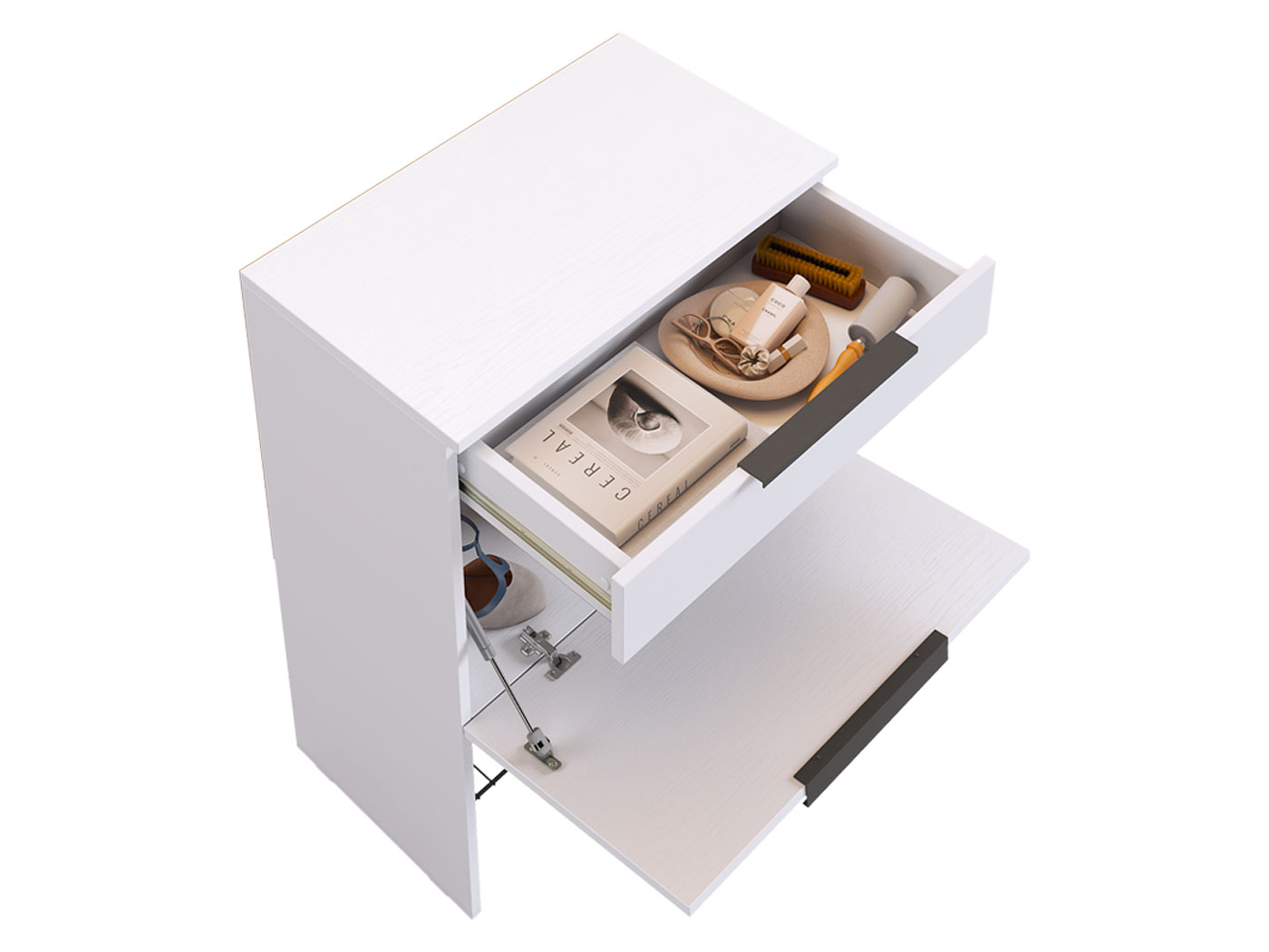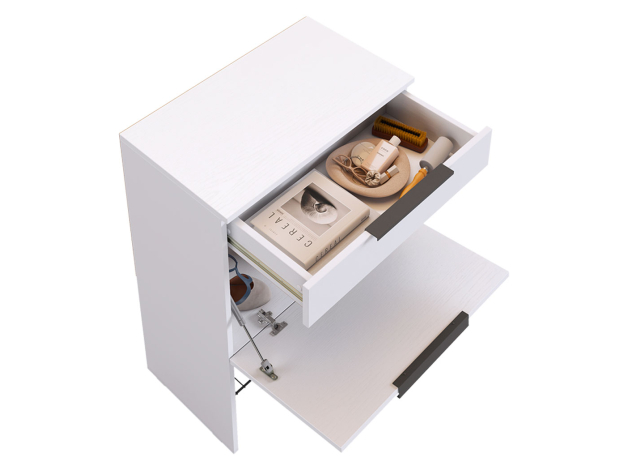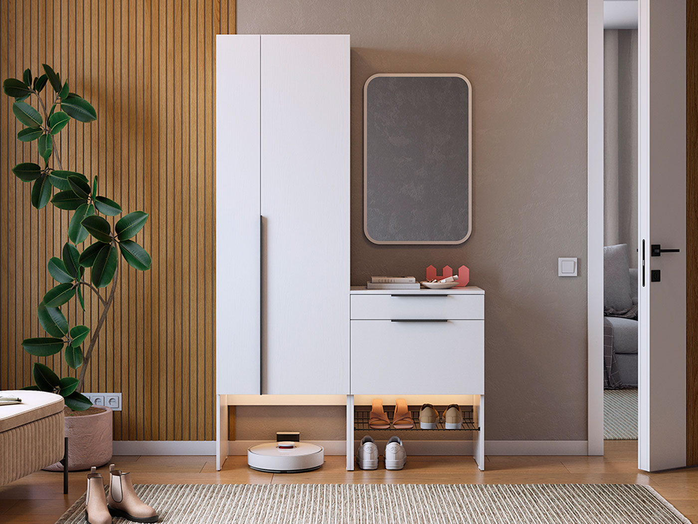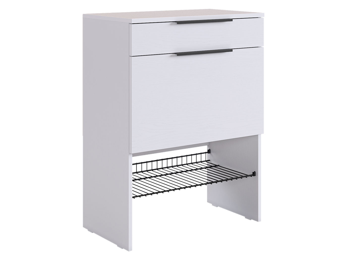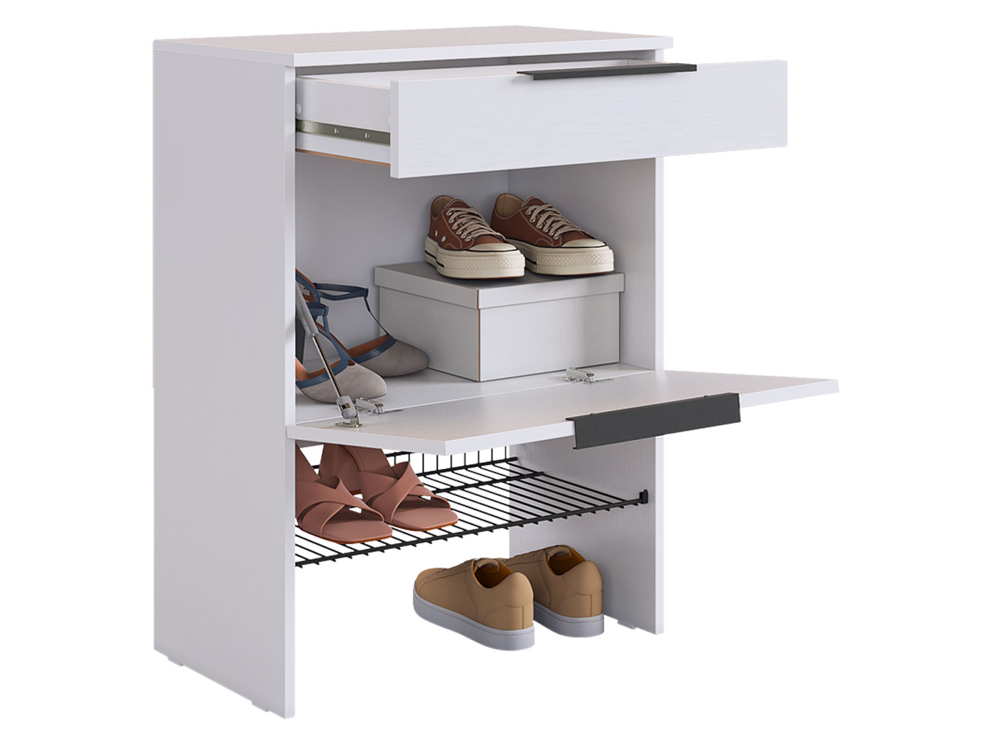 Обувница Баско — компактная современная модель, которая позволит разместить несколько пар туфель, ботинок, кроссовок, а также домашние тапочки. Выдвижной ящик подойдет для аксессуаров, за откидной дверцей можно спрятать сезонную обувь, а на открытой полке удобно хранить повседневную.