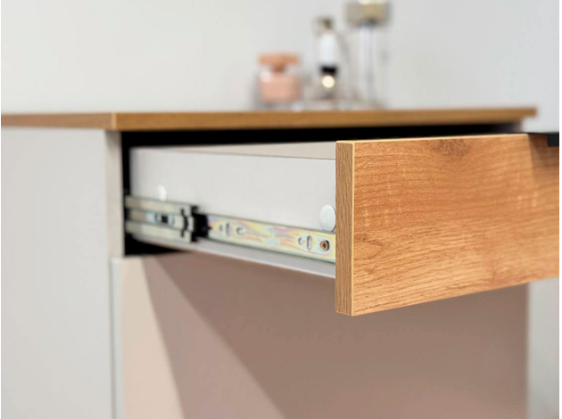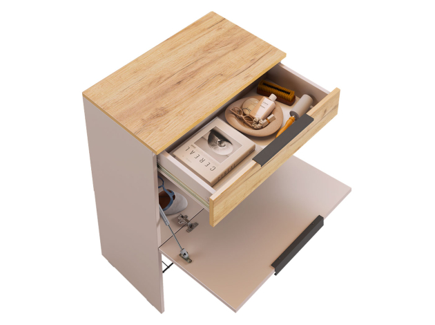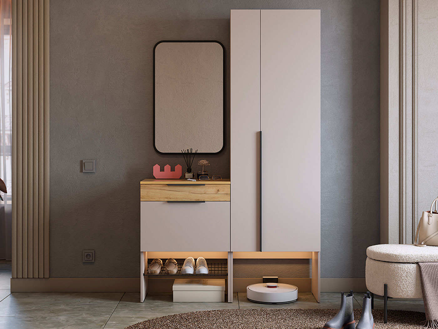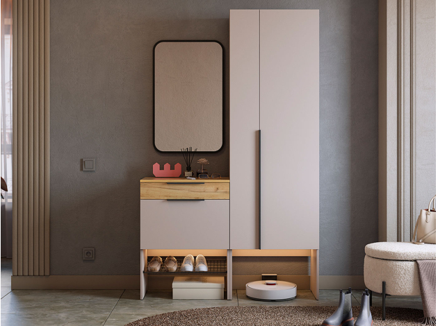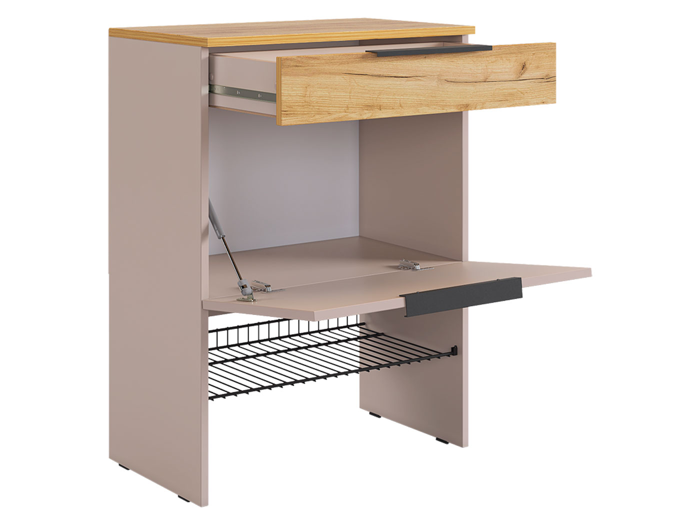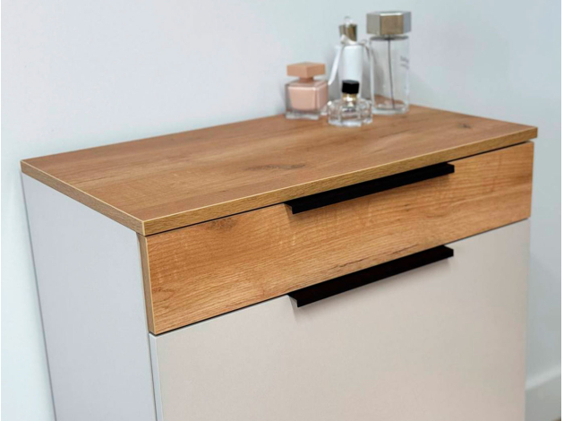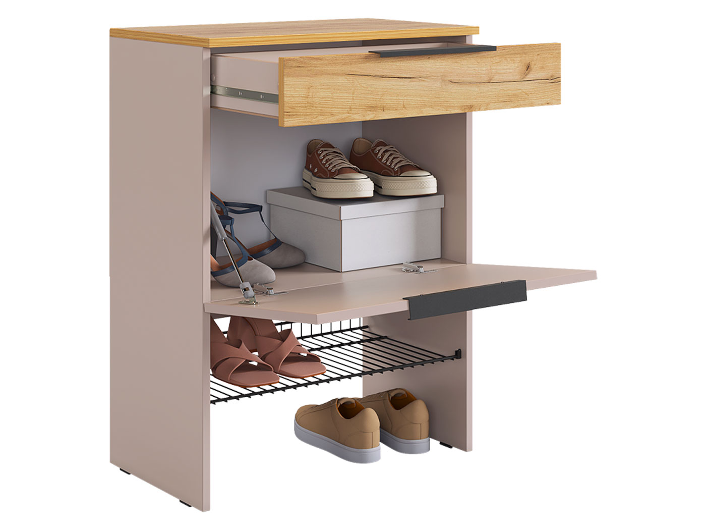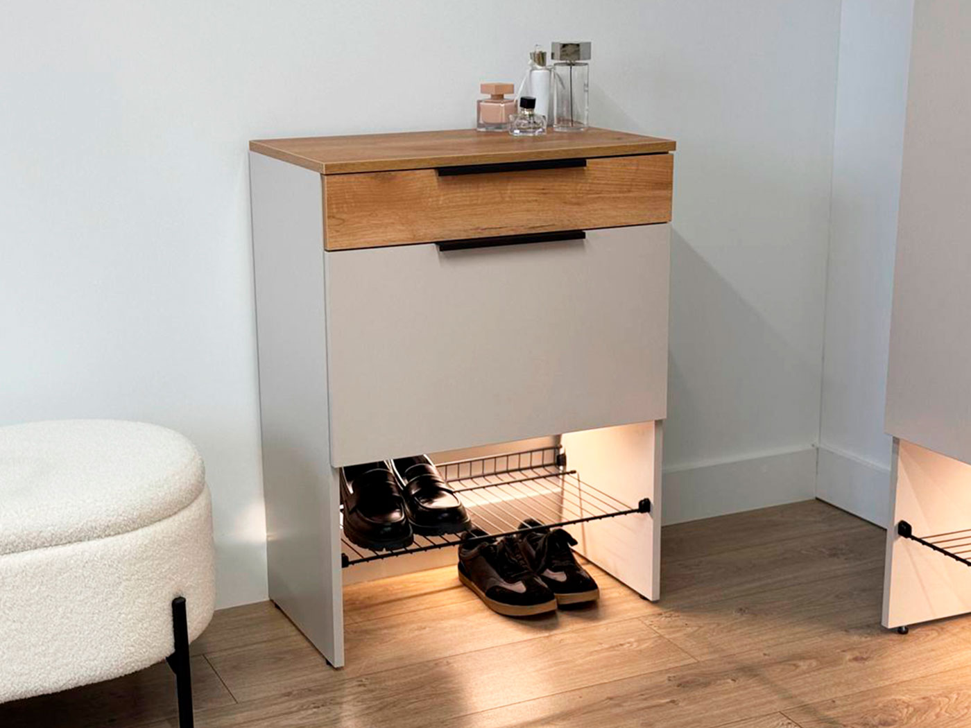 Обувница Баско — компактная современная модель, которая позволит разместить несколько пар туфель, ботинок, кроссовок, а также домашние тапочки. Выдвижной ящик подойдет для аксессуаров, за откидной дверцей можно спрятать сезонную обувь, а на открытой полке удобно хранить повседневную.