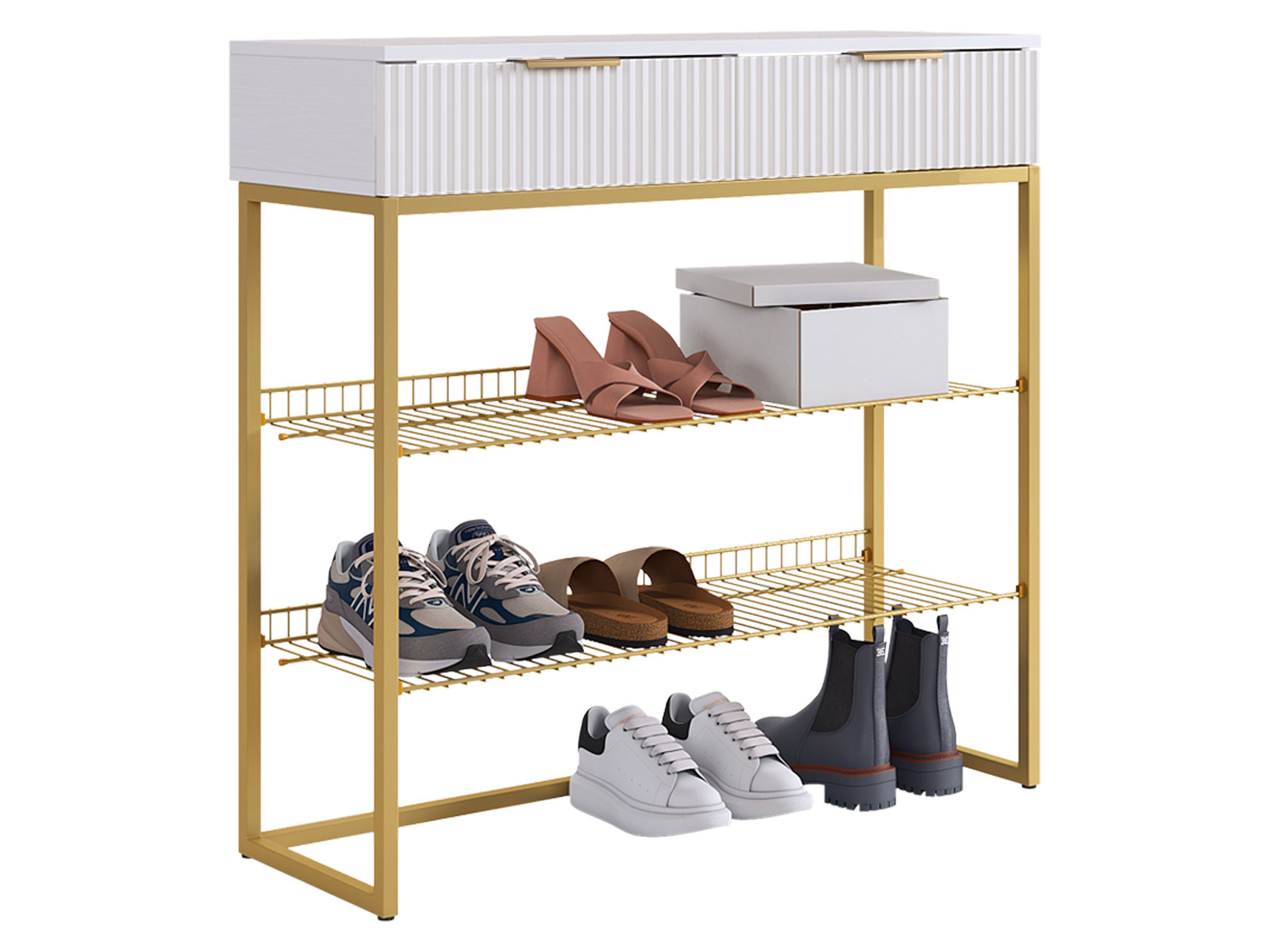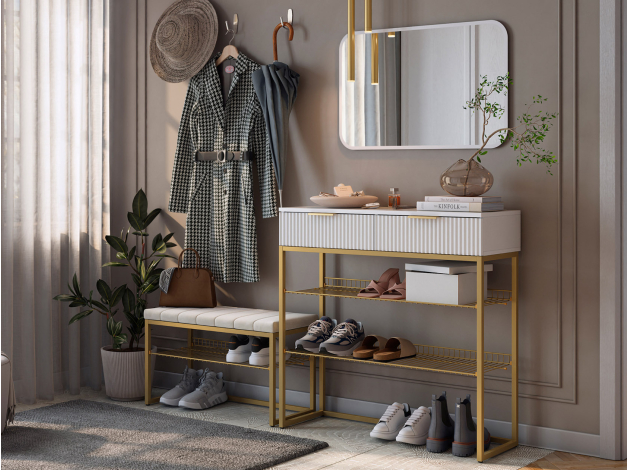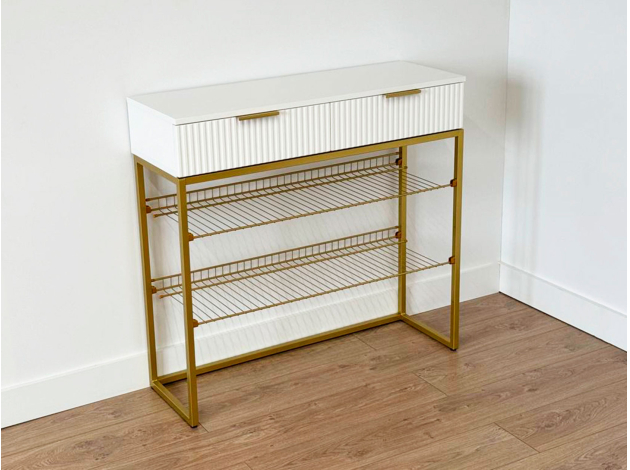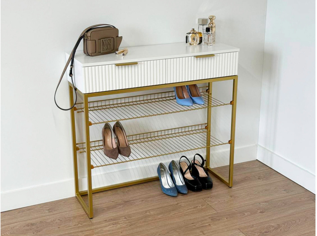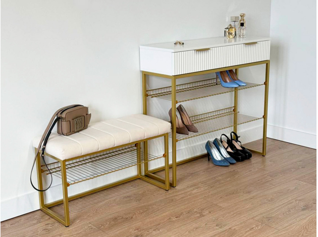 Обувница Классная поможет сэкономить пространство в прихожей. Благодаря удобной компактной конструкции модель прекрасно подойдет для небольшого коридора. Металлические полки устойчивы к влаге и легко очищаются от загрязнений. Открытые ниши позволяют разместить несколько пар обуви, а выдвижные ящики подходят для хранения подручных мелочей.