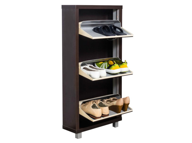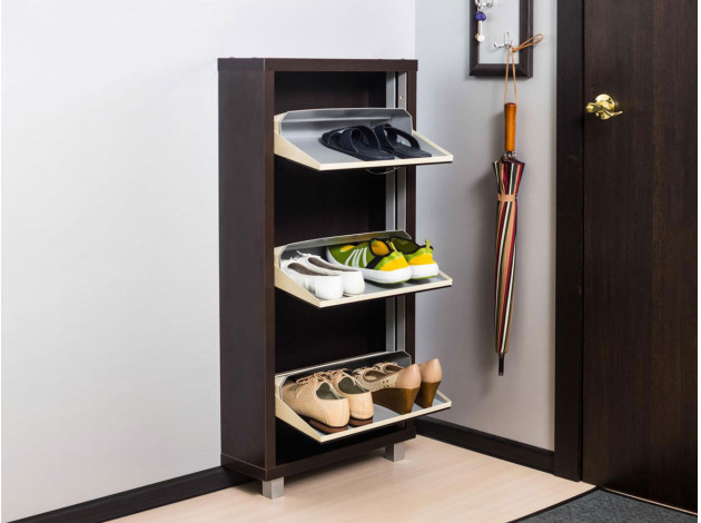Обувница Люкс 3 поможет организовать компактное хранение в небольшой современной прихожей. Продуманная конструкция работает по принципу веера: лотки открываются синхронно, позволяя выбрать нужную пару обуви.