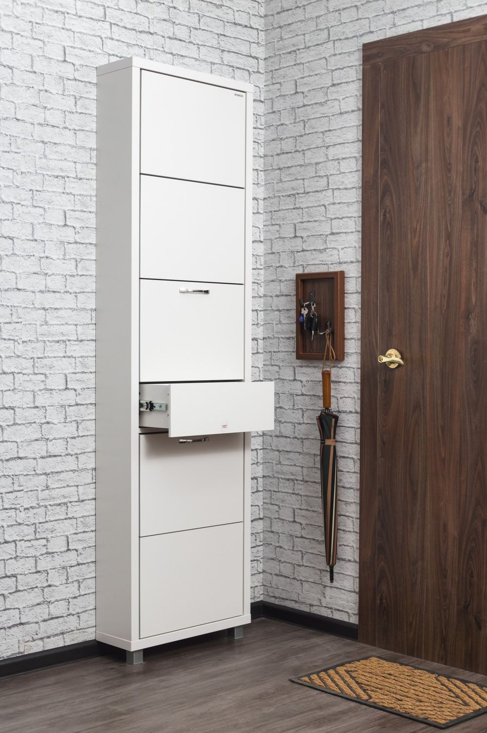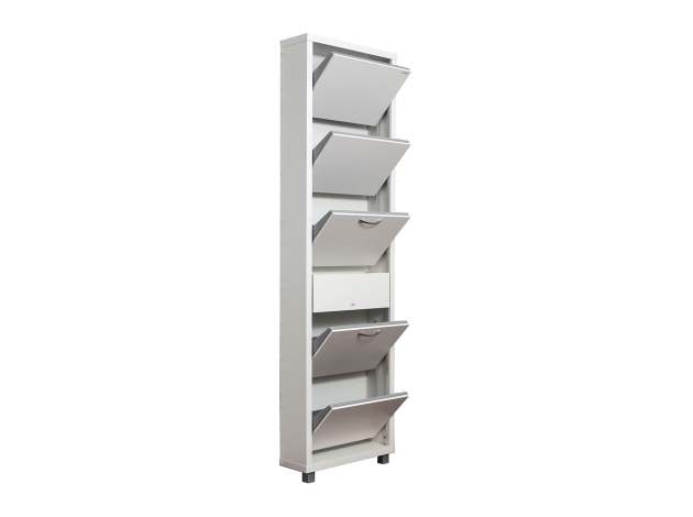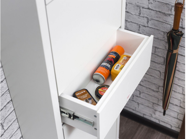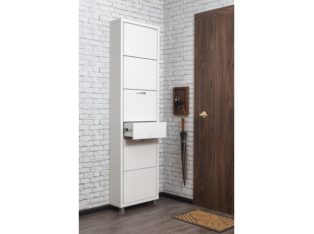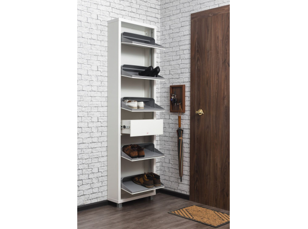Обувница Люкс Плюс 5 разместит теплые сапоги, повседневные туфли и домашние тапочки. Небольшой выдвижной ящик подходит для ключей и аксессуаров. Высокая узкая конструкция позволяет сэкономить пространство, при этом организовать образцовый порядок даже в тесной прихожей.