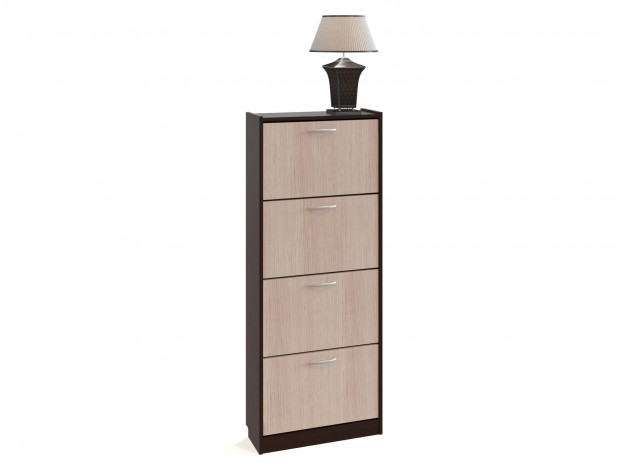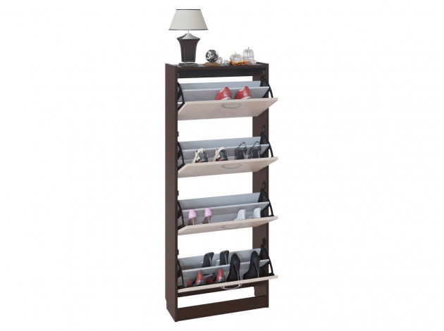 Высокая и компактная обувница Моренго 7 в классическом исполнении. Модель имеет четыре отделения по две полки в каждом и вмещает в себя примерно двенадцать пар невысокой обуви на плоской подошве. Удобно и практично. Благодаря маленькой глубине — всего 22 см, обувница не будет занимать много места.