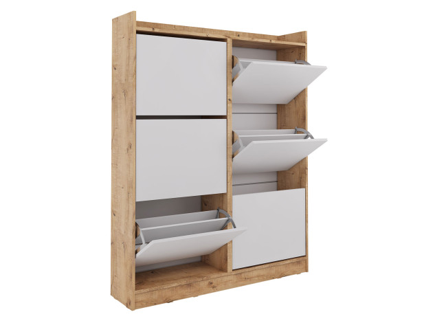 Обувница Охта Лайт организует компактное хранение в прихожей. Откидные дверцы без внешней фурнитуры открываются за края фасадов. Широкая столешница позволит разместить полезные мелочи или украсить входную зону аксессуарами.