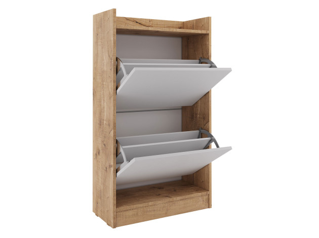 Обувница Охта Лайт организует компактное хранение в современной прихожей. Откидные дверцы без внешней фурнитуры открываются за края фасадов. Столешница позволит разместить предметы декора или держать в быстром доступе полезные мелочи.
