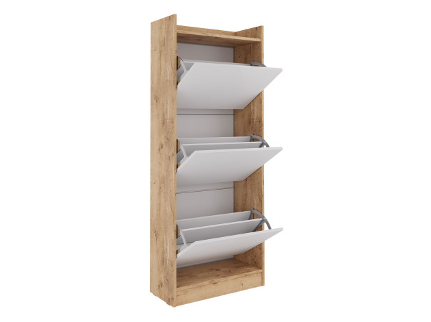 Обувница Охта Лайт — удобное решение для компактного хранения в небольшой прихожей. Откидные дверцы без внешней фурнитуры открываются за края фасадов. На столешницу можно поставить предметы декора или положить необходимые мелочи.