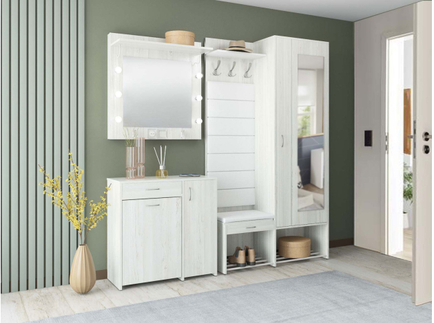 Обувница Ольга Комби — компактная модель с современным дизайном, которая позволит разместить несколько пар кроссовок и туфель, а также различные полезные мелочи. Выдвижной ящик подойдет для аксессуаров, а за распашными дверцами можно спрятать сезонную обувь. Глухие фасады оберегают содержимое от пыли и придают интерьеру более опрятный вид.