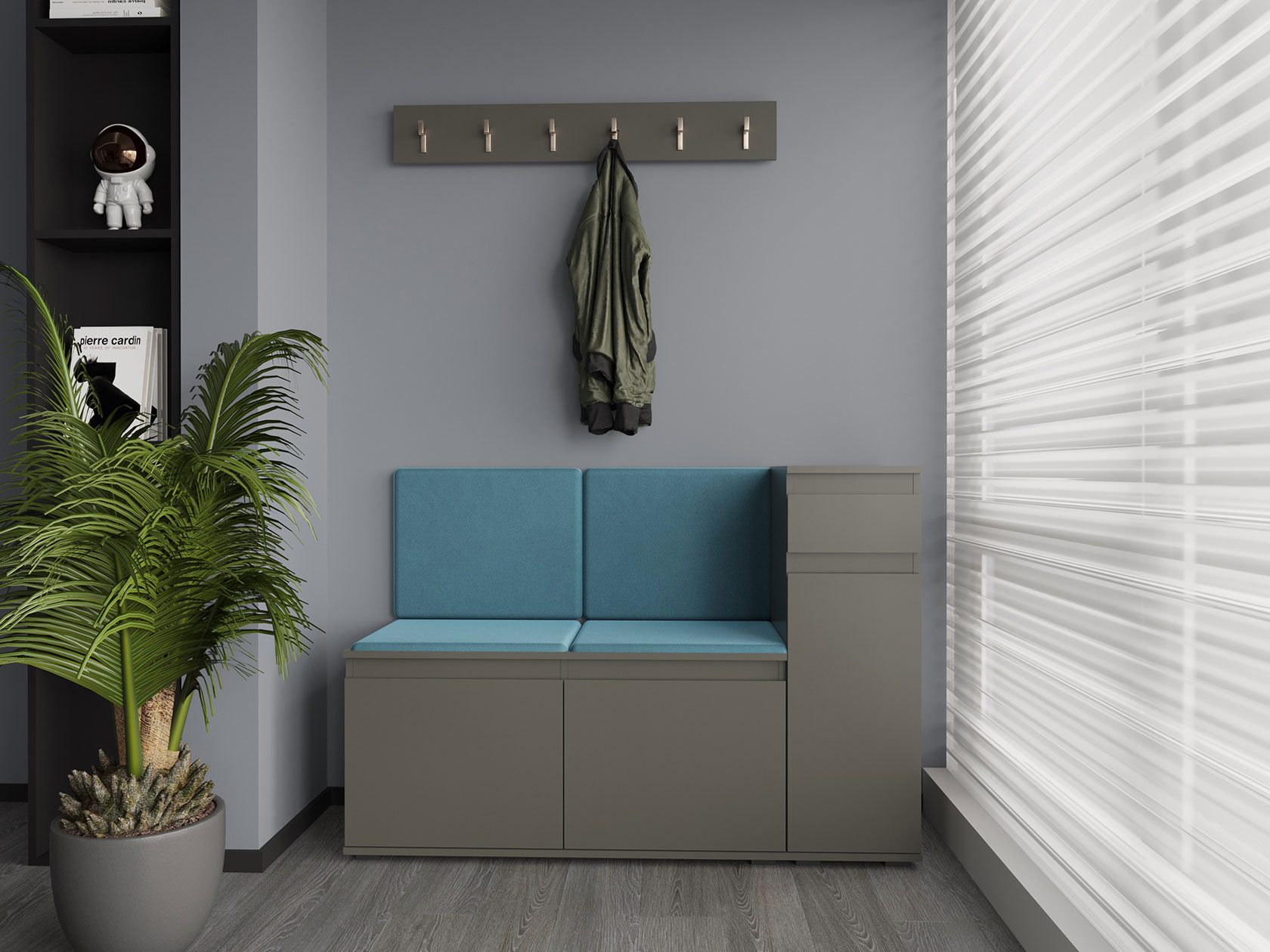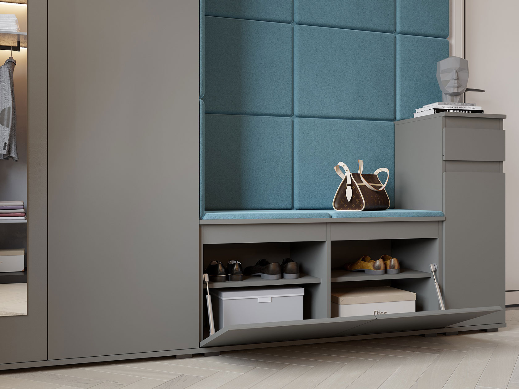 Обувница Старк гармонично дополнит интерьер прихожей, став важным функциональным элементом обстановки. Внутреннее пространство позволяет распределить всю обувь по категориям. Выдвижной ящик подходит для хранения мелочей. Современный дизайн без ручек адаптируется под различные стили меблировки.