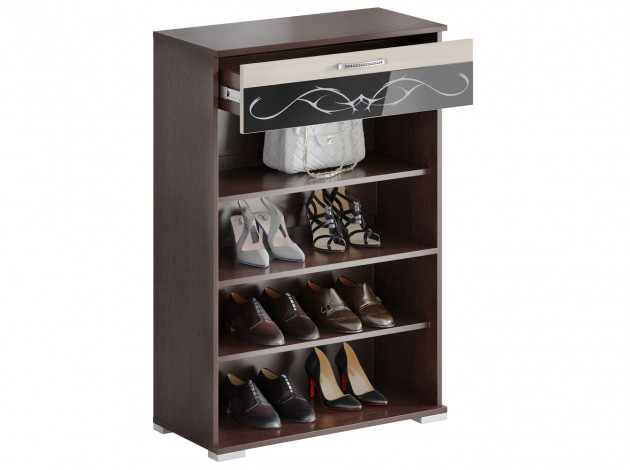 Обувница Юнона подойдет для размещения даже в самой маленькой прихожей. Модель состоит из двух полочек для обуви и выдвижного ящика для различных аксессуаров и мелочей.