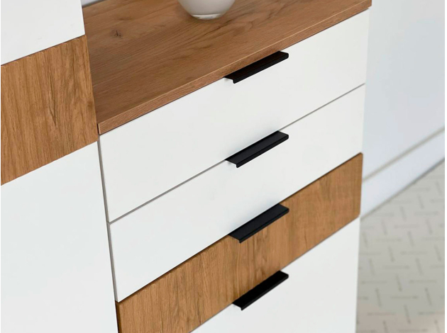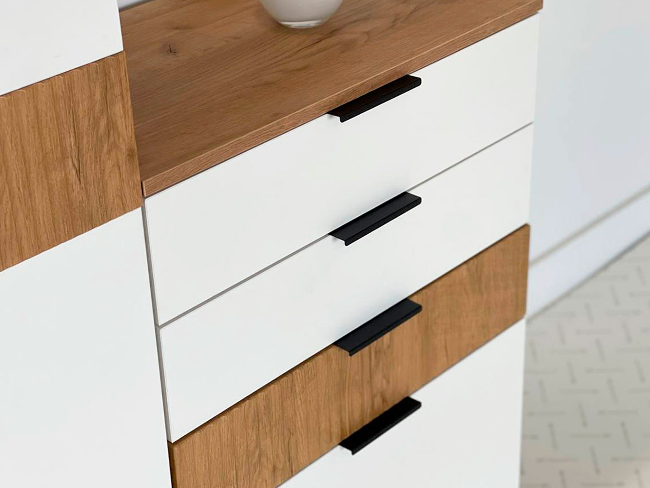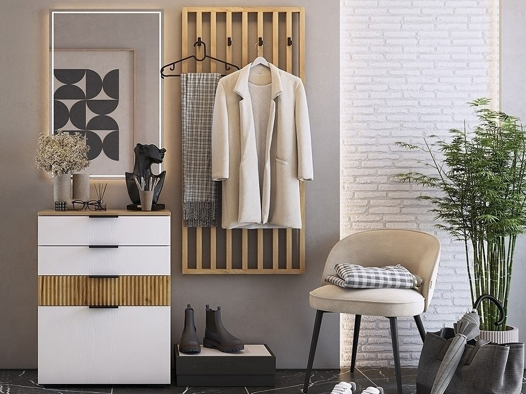 Прихожая с комодом Адам — компактное решение для обустройства небольшой входной зоны. Сочетание матовых фасадов и древесной текстуры создает уютную обстановку. Для верхней одежды предусмотрена панель с крючками, а для аксессуаров и обуви — стильный комод с ящиками и откидной дверцей.