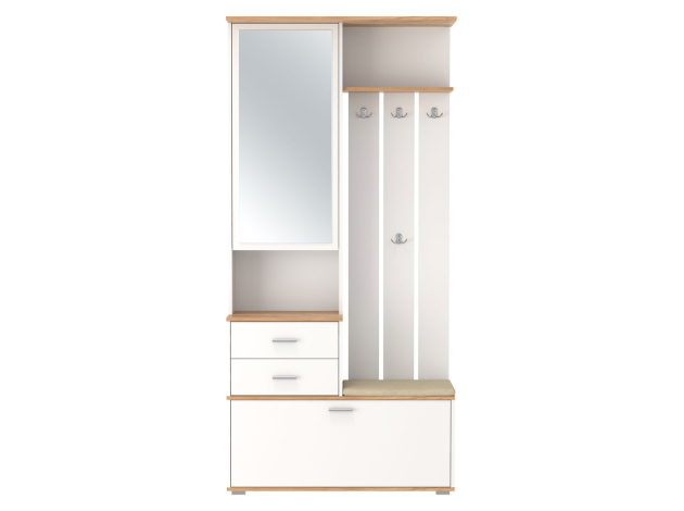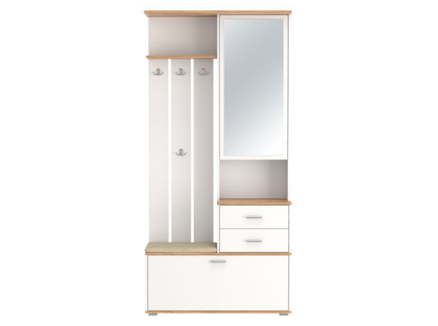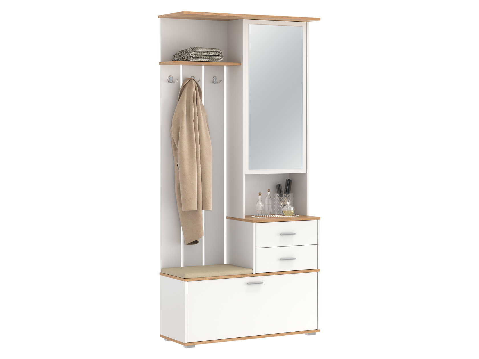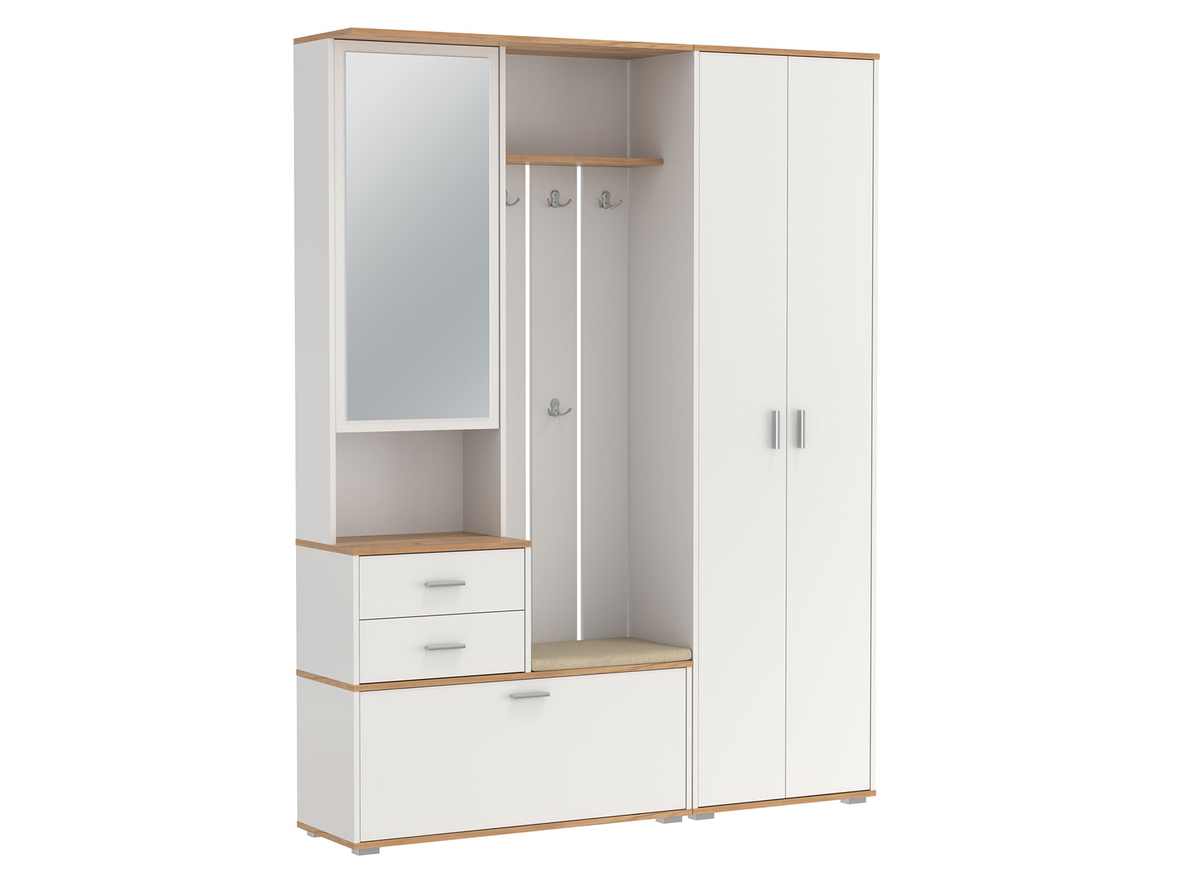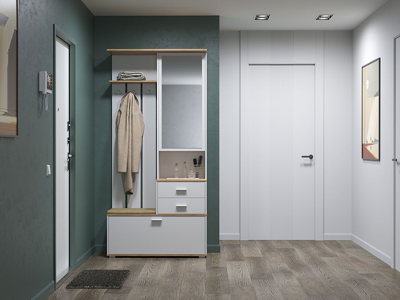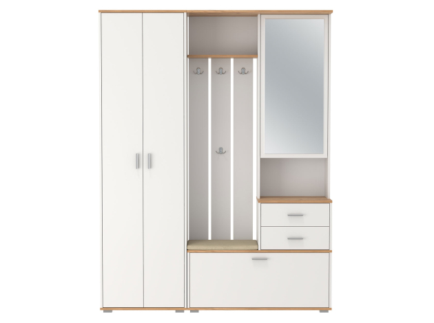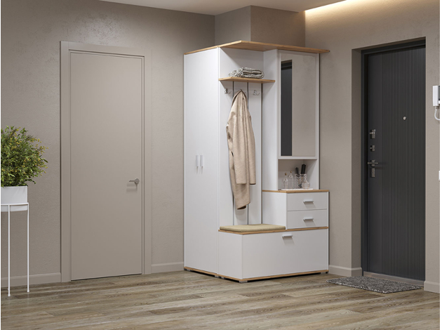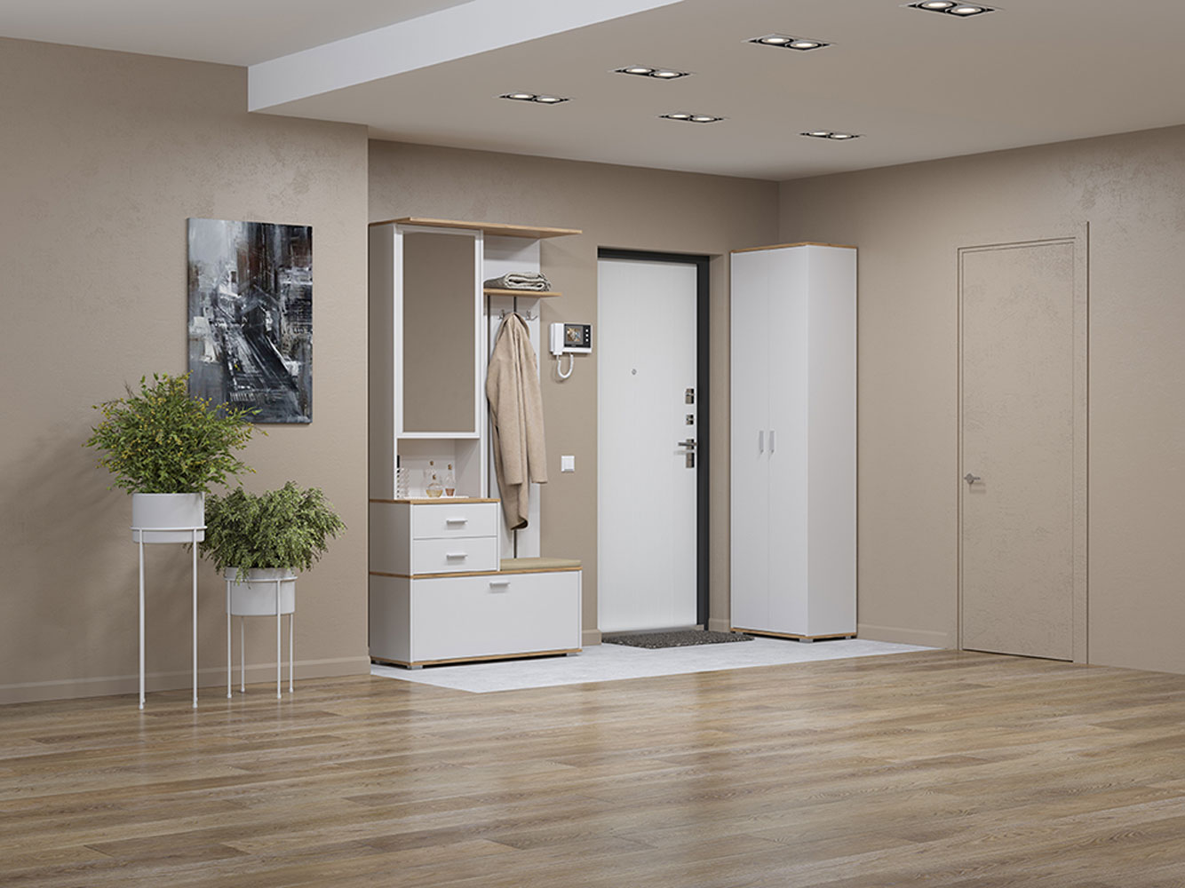 Прихожая Антре Дуо станет практичным и стильным акцентом интерьера. Продуманный набор мебели позволяет поддерживать порядок даже в ограниченном пространстве. В шкафу найдется место для верхней одежды, а тумба с откидной дверцей идеально подходит для обуви. Открытая вешалка с крючками и полкой удобны для быстрого доступа к одежде и аксессуарам.
