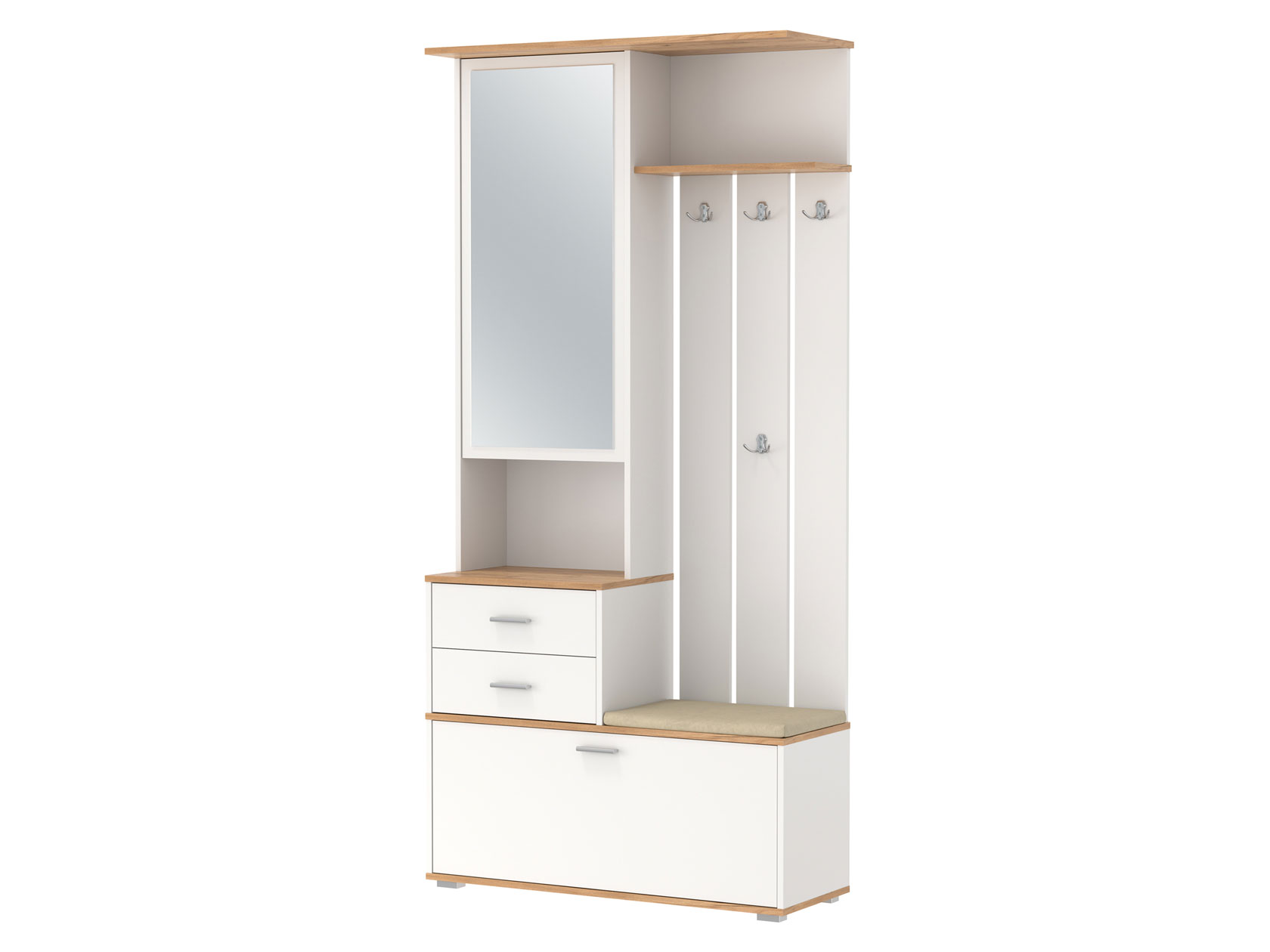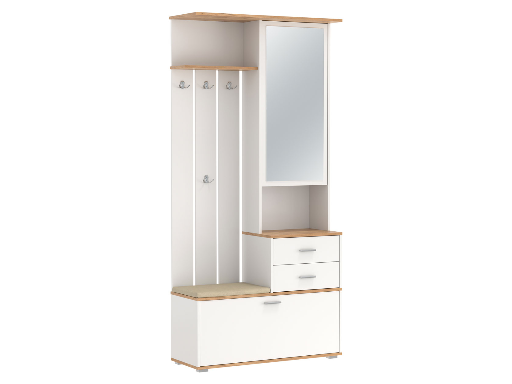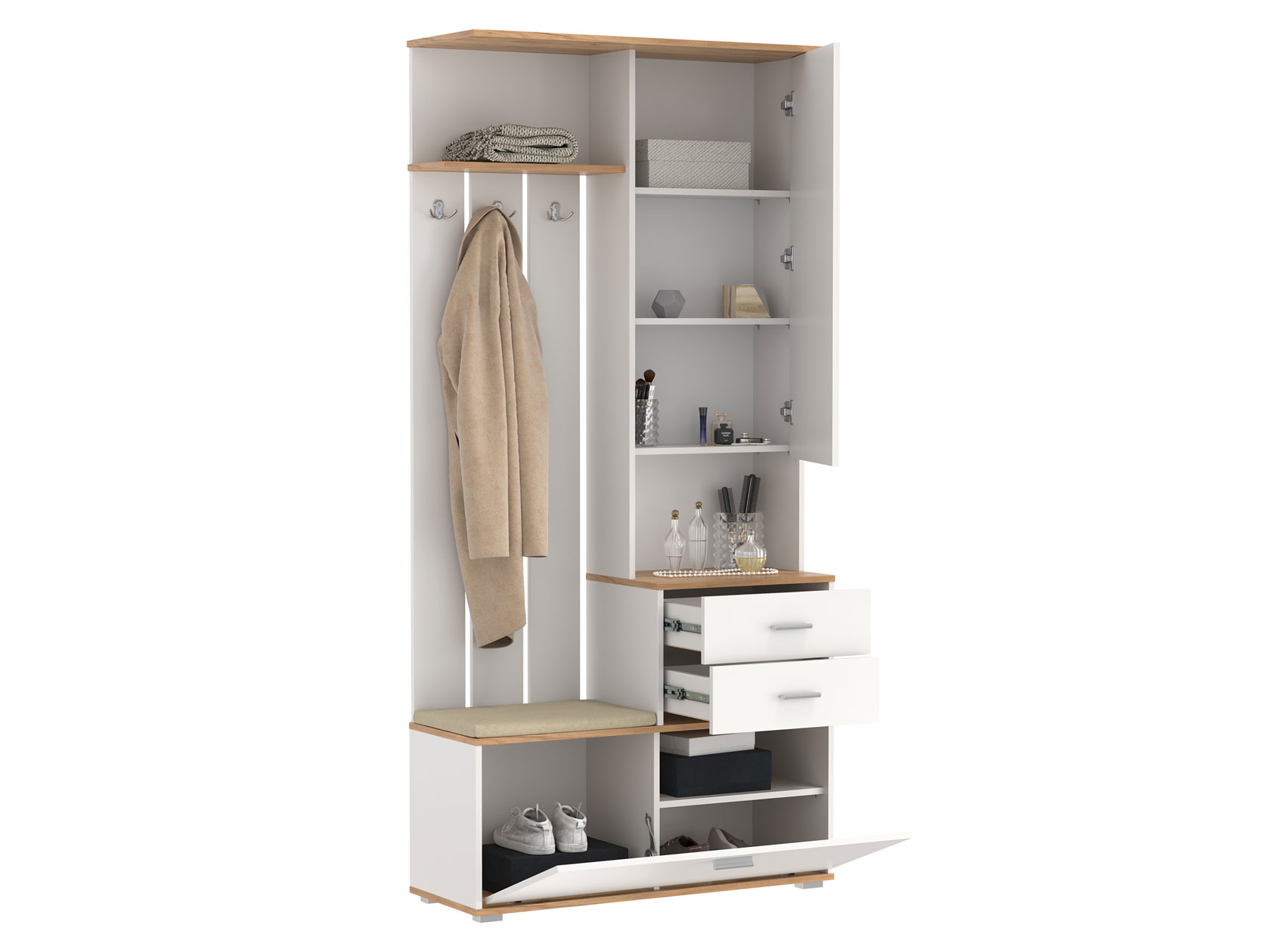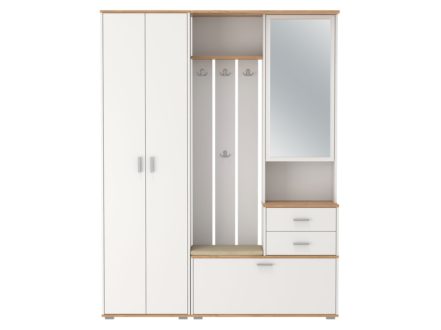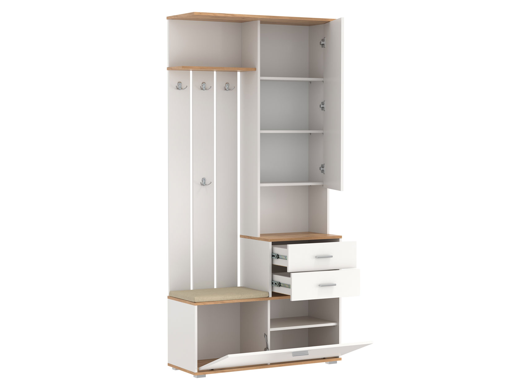 Прихожая Антре Дуо станет практичным и стильным акцентом интерьера. Продуманный набор мебели позволяет поддерживать порядок даже в ограниченном пространстве. В шкафу найдется место для верхней одежды, а тумба с откидной дверцей идеально подходит для обуви. Открытая вешалка с крючками и полкой удобны для быстрого доступа к одежде и аксессуарам.