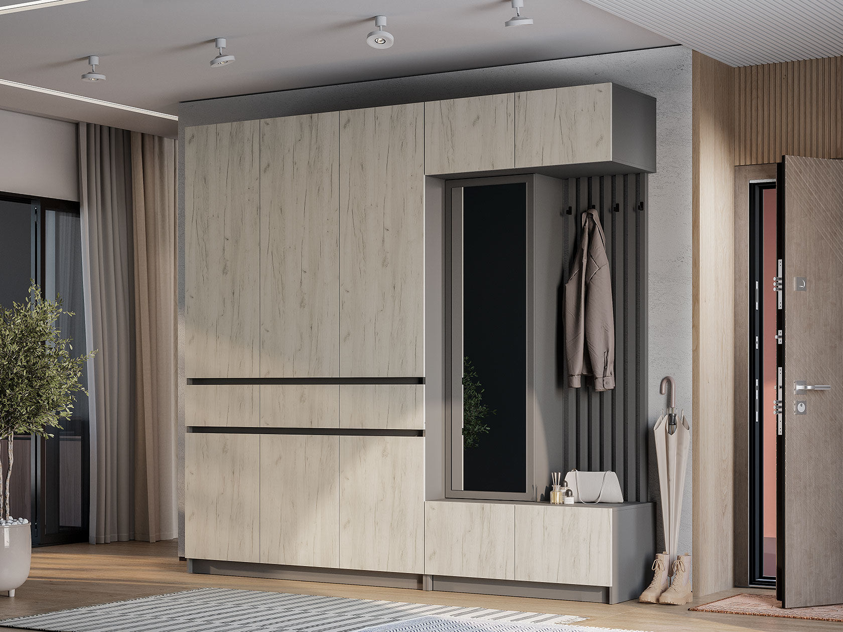 - Механизм открывания дверей прихожей: распашной «push-to-open».