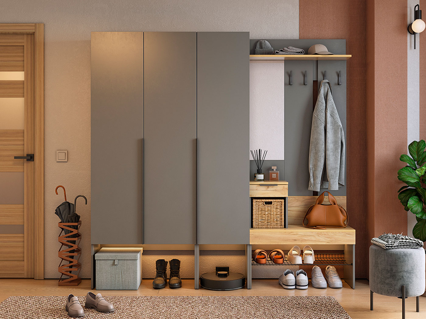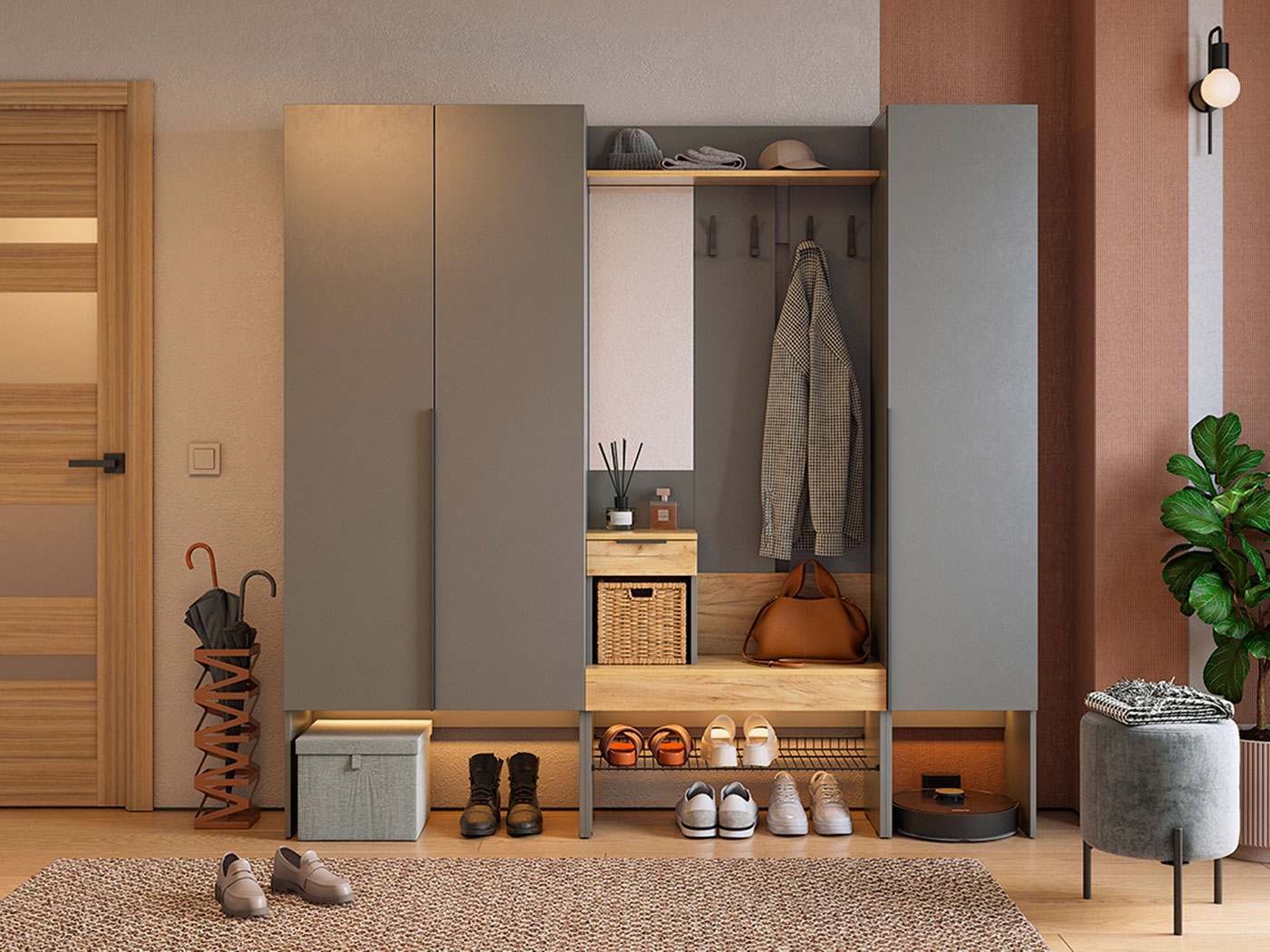 Прихожая Баско Ультра подойдет хранения всех необходимых вещей большой семьи. Распашные шкафы со штангой и полками обеспечат место для курток, пальто, коробок с обувью и аксессуаров. Лаконичный дизайн дополнен вертикальными ручками, что прекрасно сочетается с разными стилями интерьера.