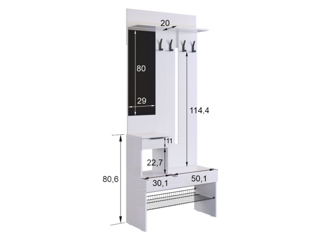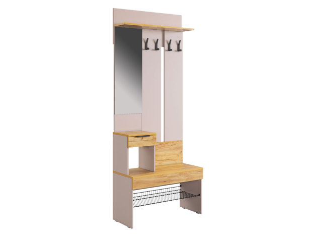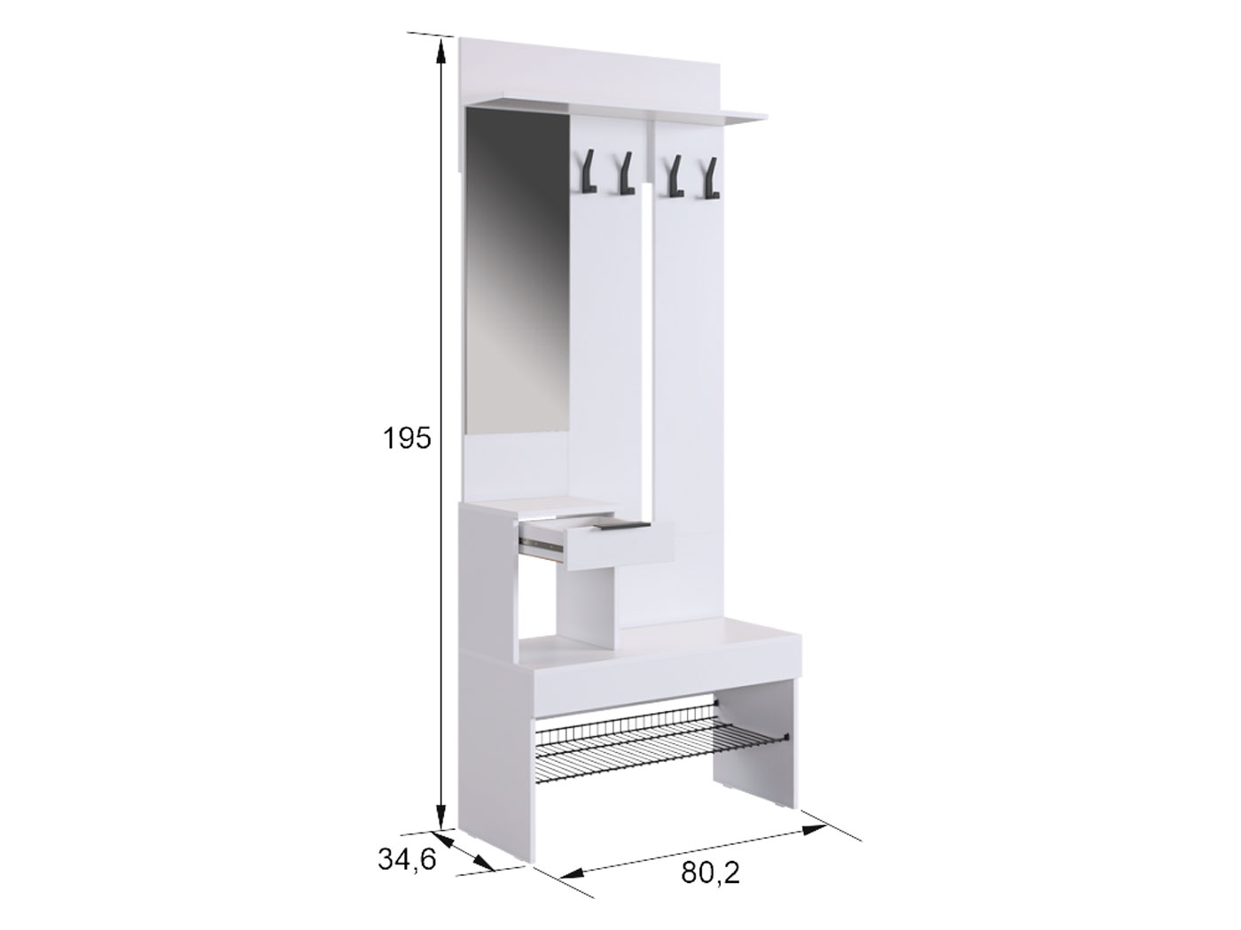 Прихожая Баско Мини — простой и практичный способ дополнить интерьер входной зоны. Распашной шкаф позволит хранить сезонную одежду, а на вешалке с крючками удобно разместить пальто и куртки. Открытая полка обеспечит уголок для нескольких пар обуви. Нижнюю полку можно использовать, чтобы поставить сумки.