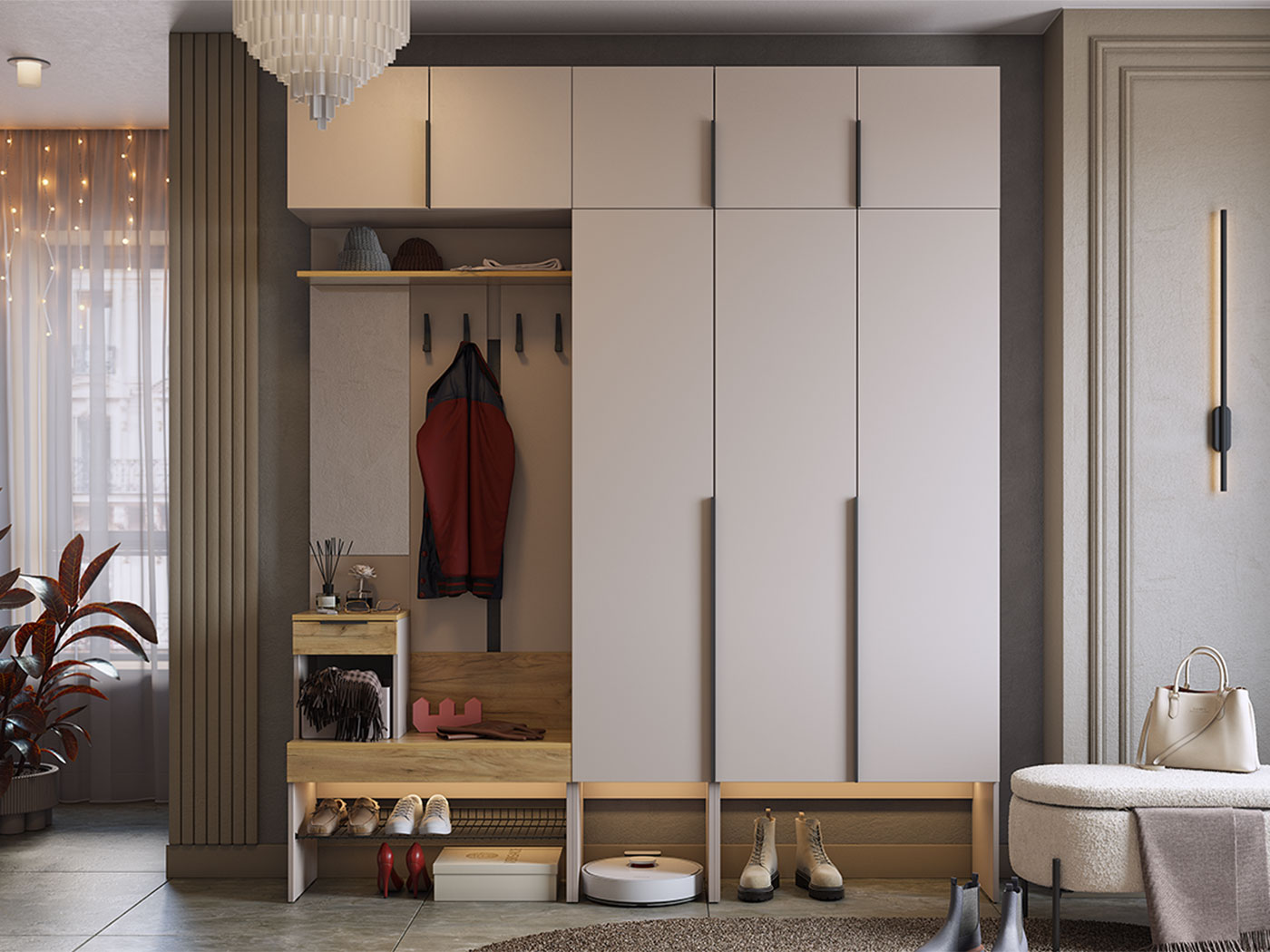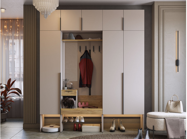 Прихожая Баско Комби станет оптимальным выбором для большой семьи. Распашные шкафы можно расположить в произвольном порядке. Просторные секции дополнены антресолями, которые позволят разместить редко используемые вещи.