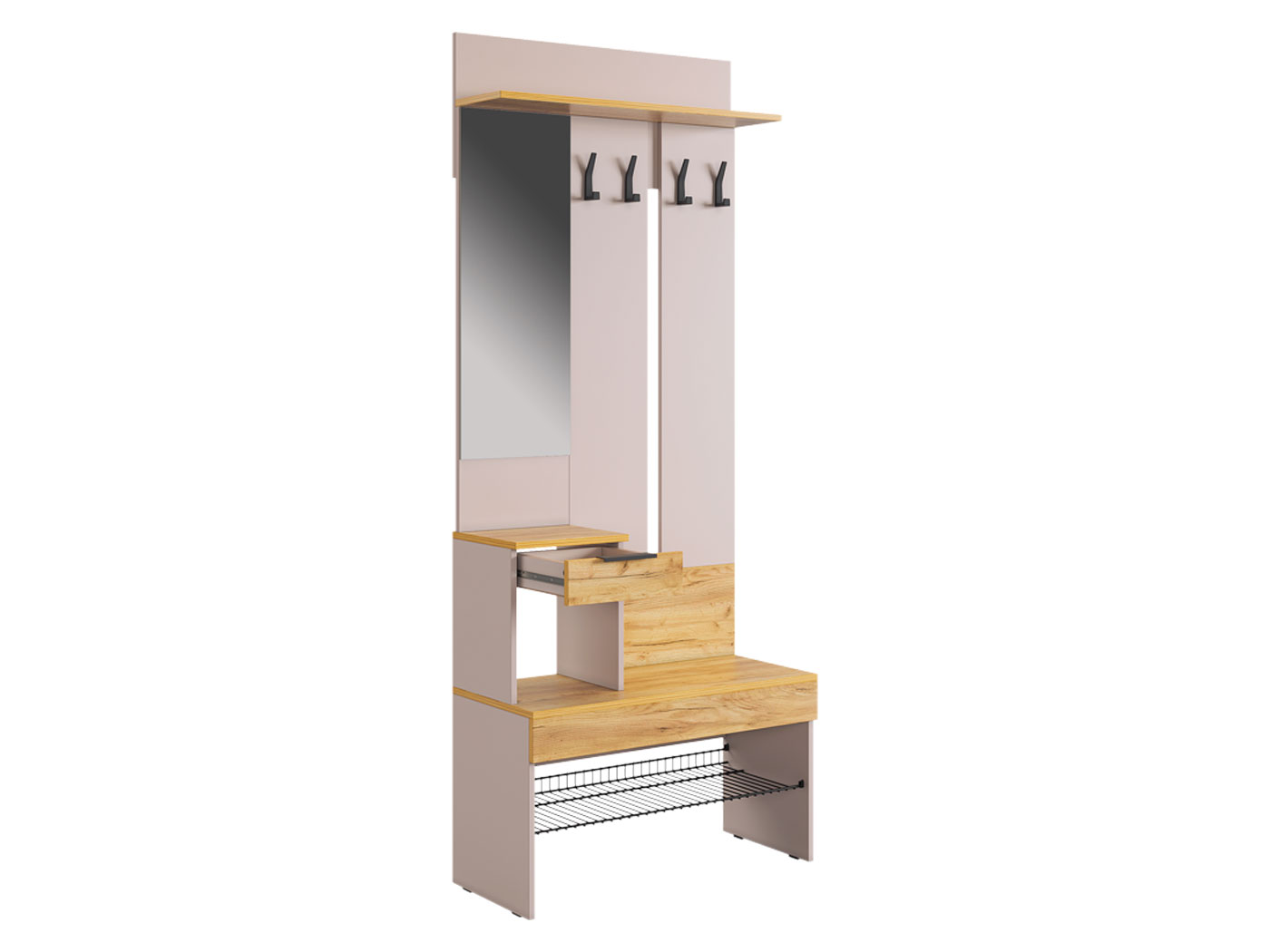 Прихожая Баско Квинто создаст вместительную систему хранения. Центром композиции служит открытая вешалка с прочными крючками, которые способны выдержать тяжелые предметы гардероба. Обувница с полкой-решеткой обеспечивает обзор необходимых пар туфель и ботинок. Сдержанны облик элементов сочетается с различными стилями меблировки.