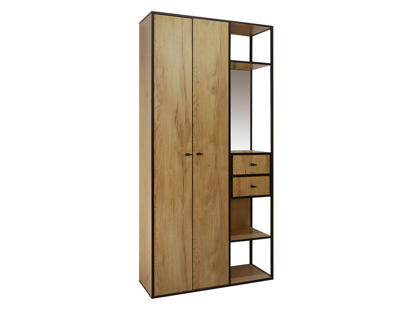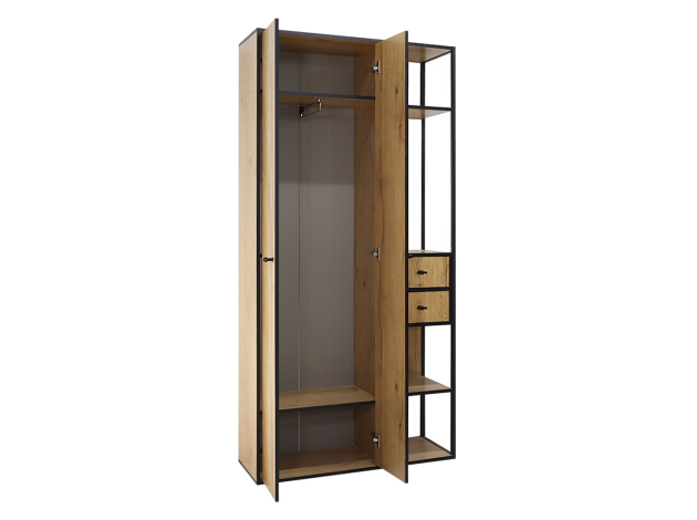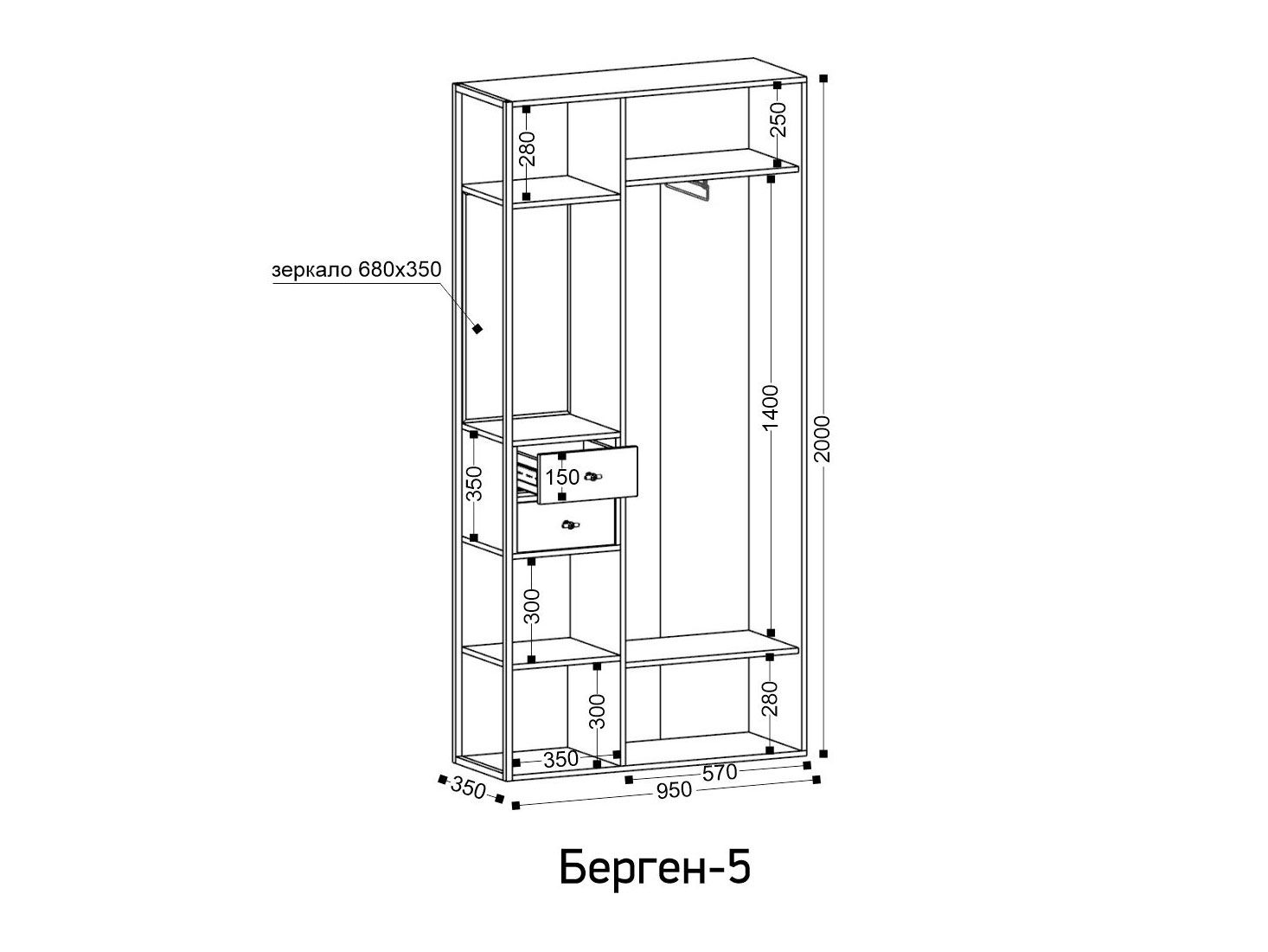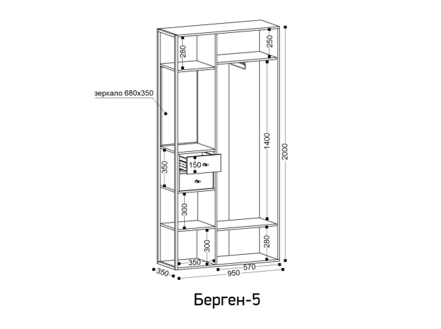Прихожая Берген — удобный способ компактно разместить верхнюю одежду, обувь и важные мелочи, которые понадобятся перед выходом из дома. За дверцами можно спрятать пальто и куртки, а в открытых нишах — расположить сумки. Выдвижные ящики идеально подходят для хранения ключей, очков и небольших аксессуаров. Зеркало добавляет пространству света и позволяет оценить свой внешний вид.