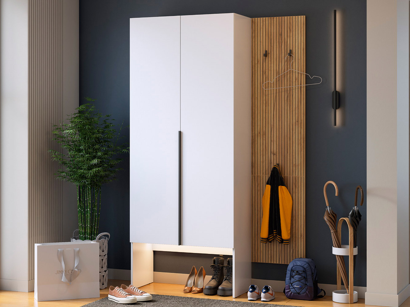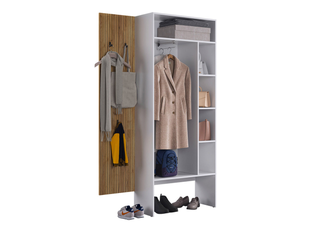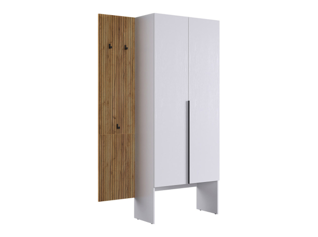 Прихожая Бодрум Дуэт — компактное и функциональное решение для современного интерьера. Распашной шкаф и открытая вешалкой обеспечат место для повседневной и верхней одежды. Гладкие фасады и узкая вертикальная ручка подчеркивают строгую геометрию мебели, а древесный декор придает обстановке теплоту и уют.