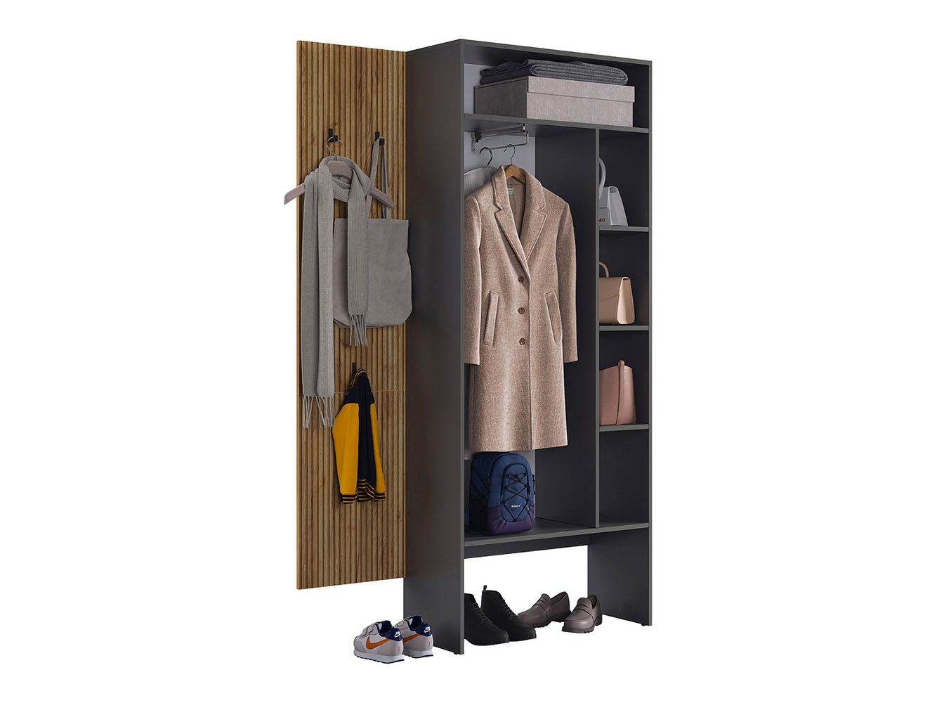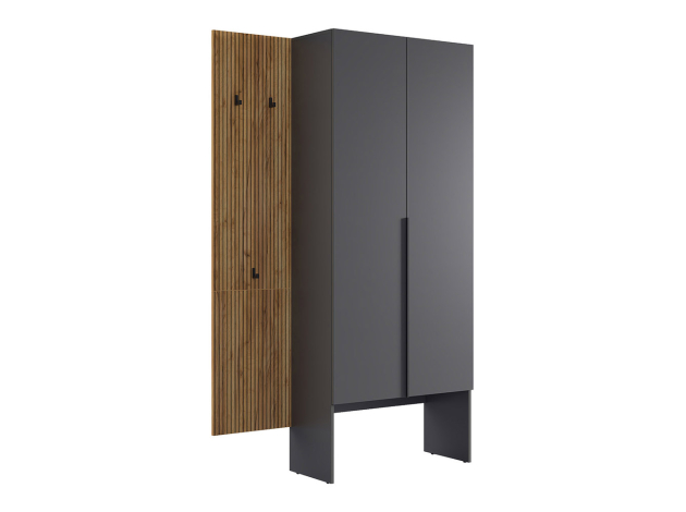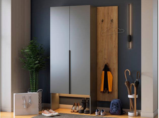 Прихожая Бодрум Дуэт — компактное и функциональное решение для современного интерьера. Распашной шкаф и открытая вешалкой обеспечат место для повседневной и верхней одежды. Гладкие фасады и узкая вертикальная ручка подчеркивают строгую геометрию мебели, а древесный декор придает обстановке теплоту и уют.