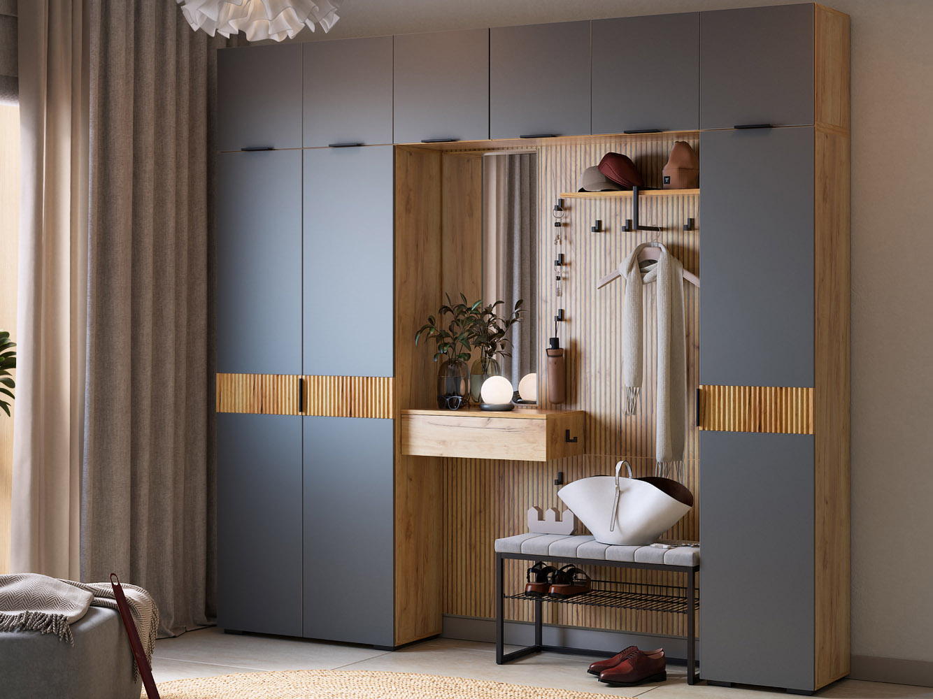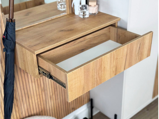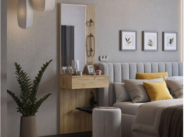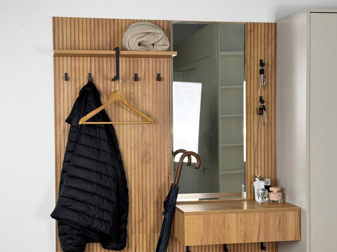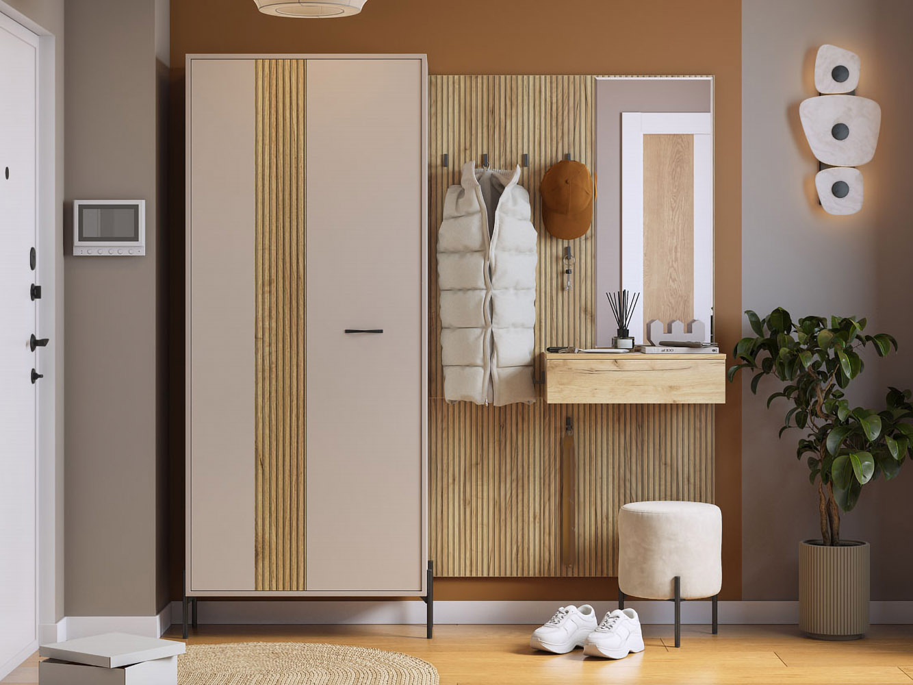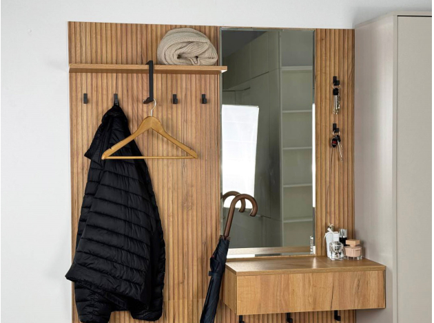 Прихожая Бодрум станет прекрасным дополнением интерьера: она визуально расширит пространство и позволит оценить внешний вид перед выходом из дома. Лаконичное зеркальное полотно без рамы не перетягивает внимание и позволяет хорошо рассмотреть свое отражение.