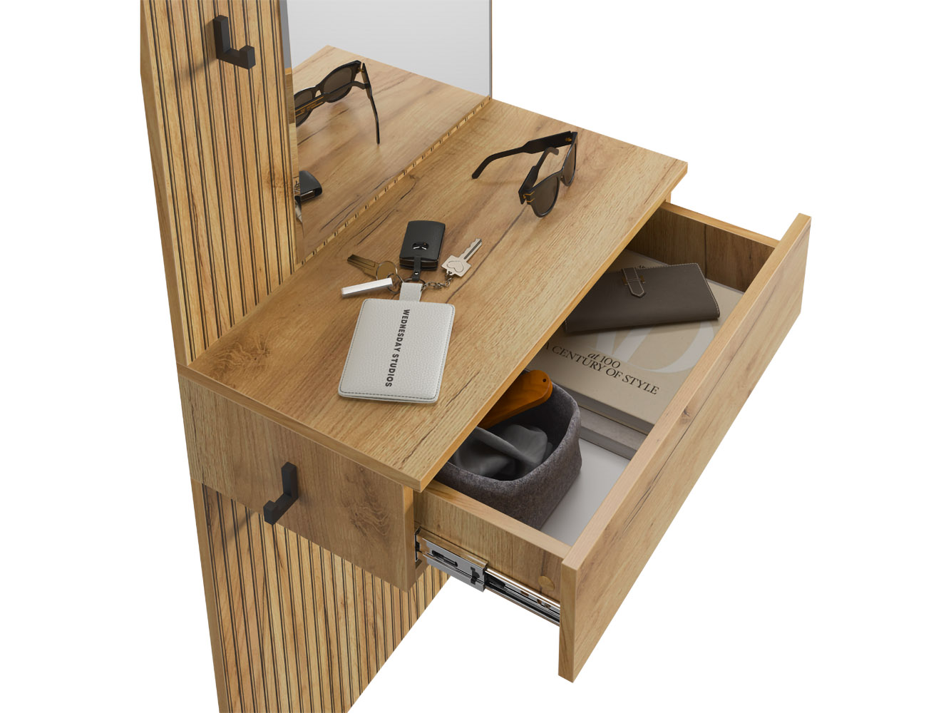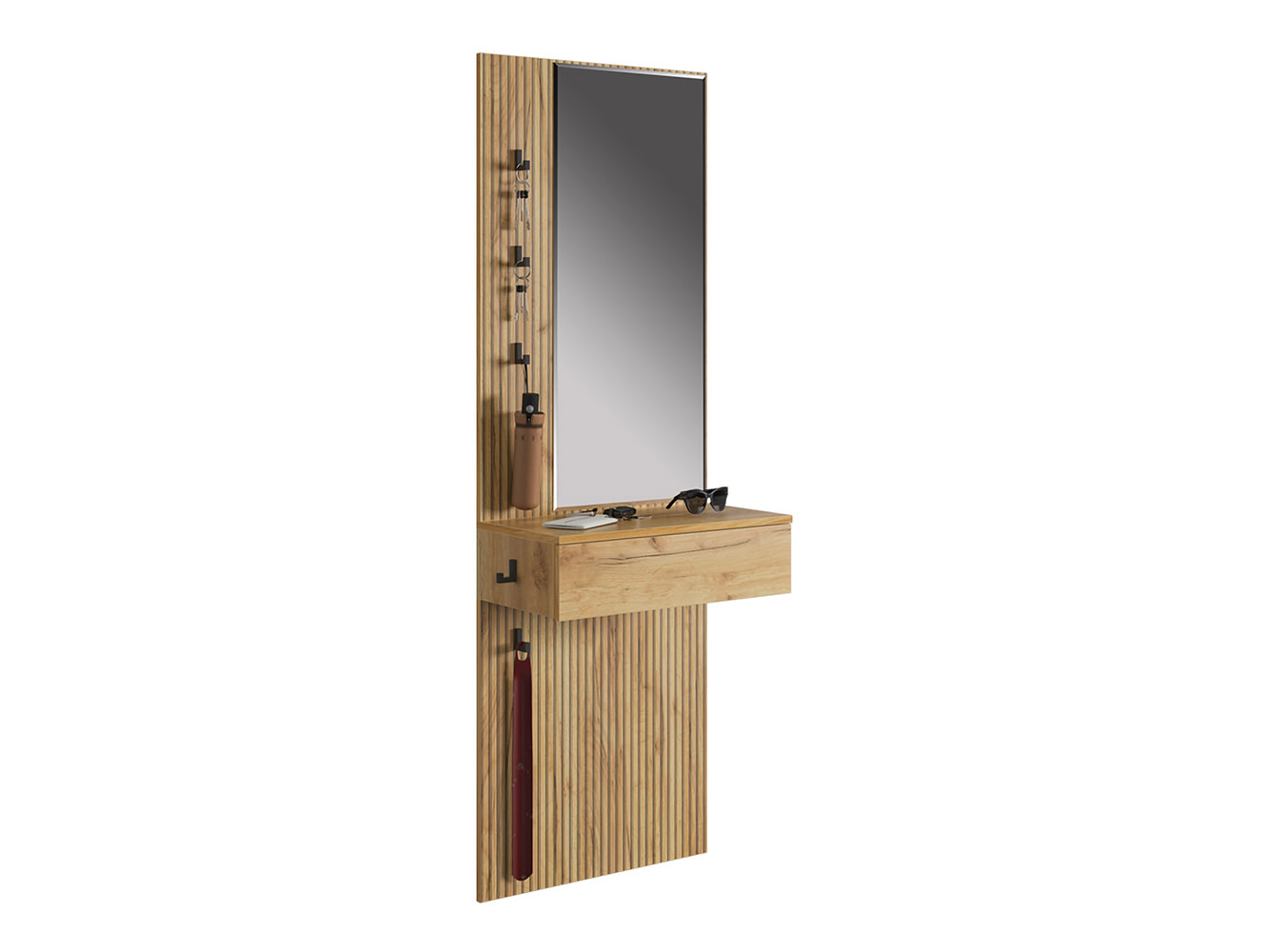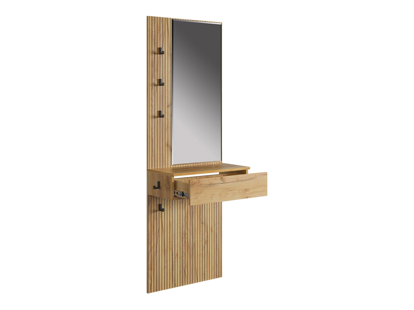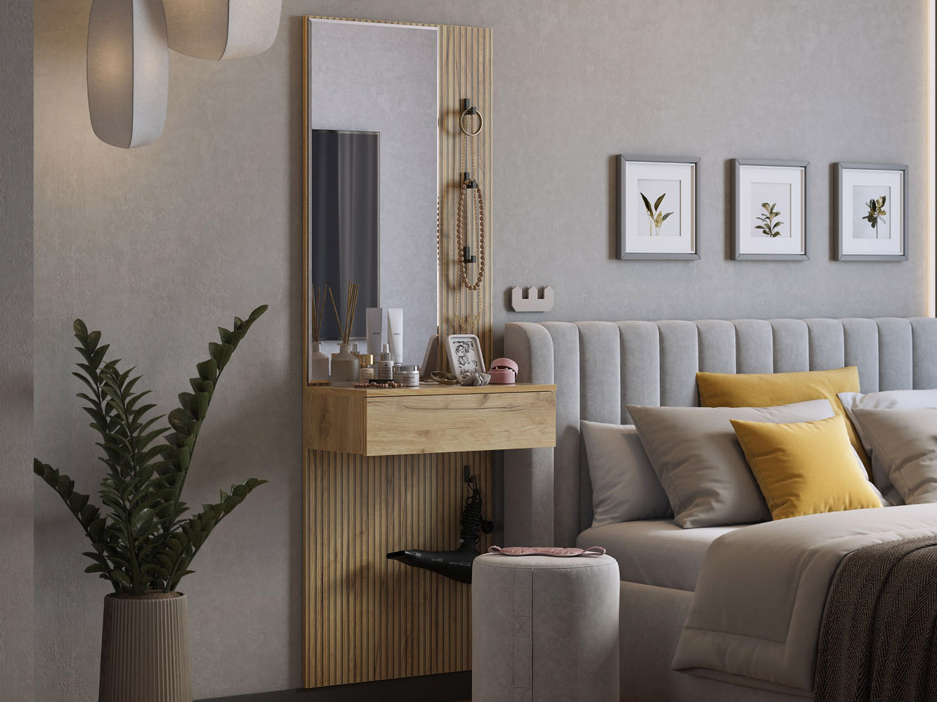 Прихожая Бодрум станет прекрасным дополнением интерьера: она визуально расширит пространство и позволит оценить внешний вид перед выходом из дома. Лаконичное зеркальное полотно без рамы не перетягивает внимание и позволяет хорошо рассмотреть свое отражение.