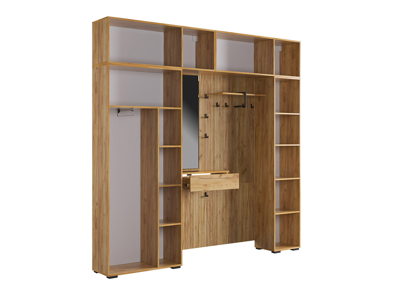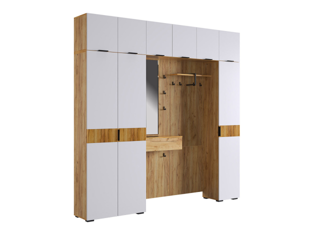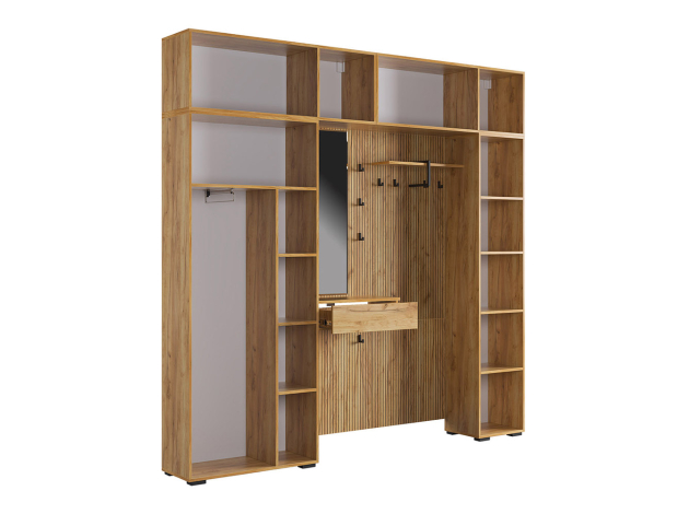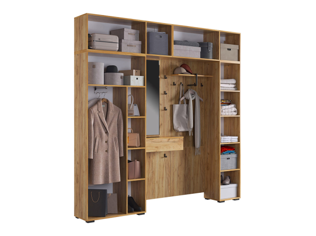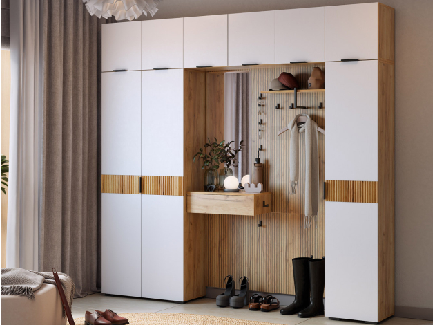 Прихожая Бодрум Макси создаст идеальный порядок и организует удобное хранение предметов гардероба. Внутреннее наполнение шкафов представлено множеством полок и нишей со штангой, что позволяет разграничить повседневную и верхнюю одежду. Древесный декор и матовые фасады актуально выглядят и легко интегрируются в различные стили меблировки.