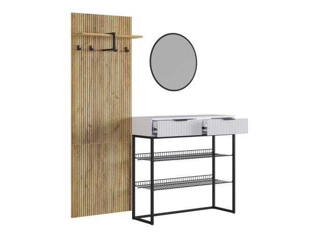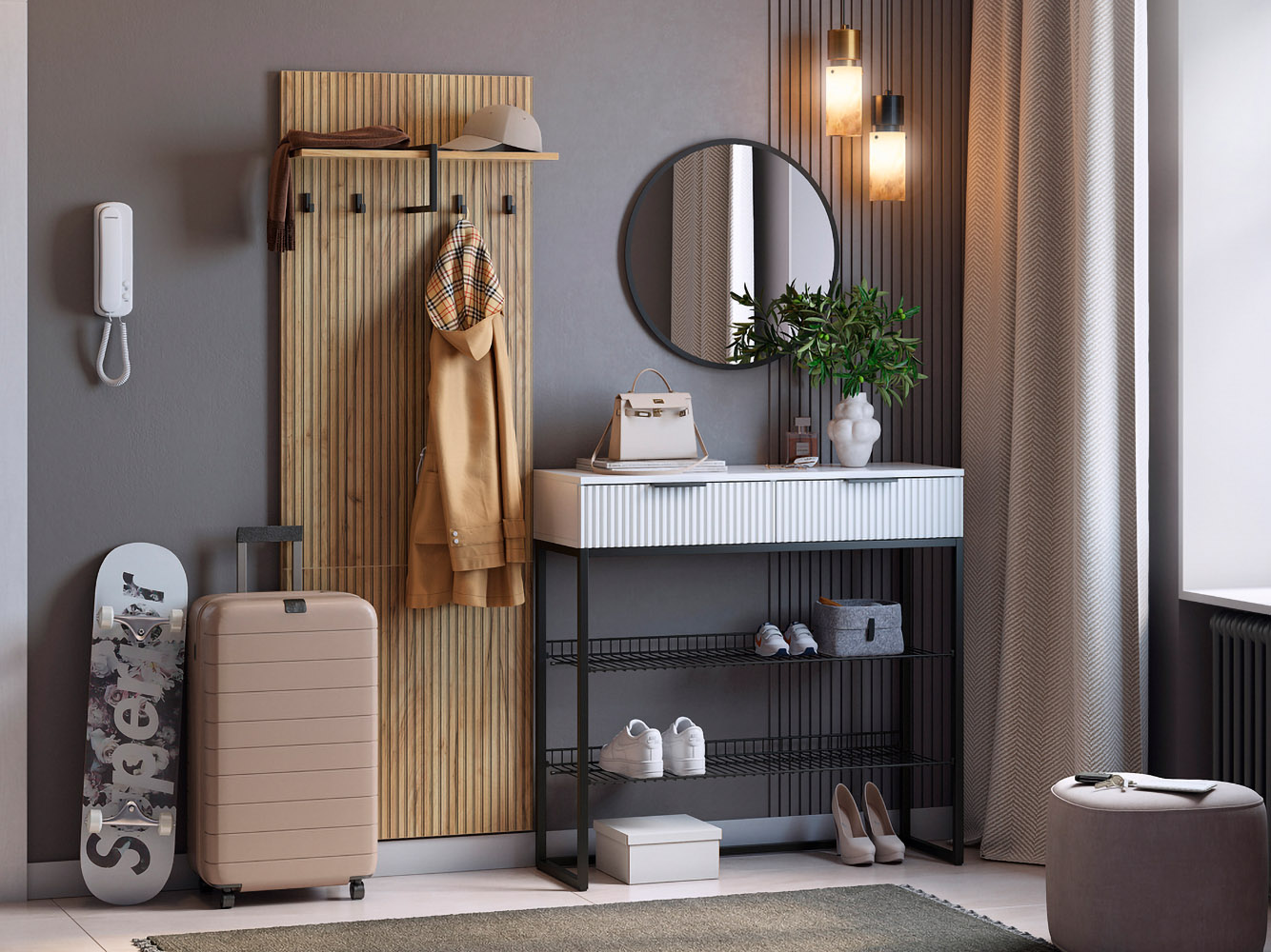 Прихожая Бодрум Стандарт украсит небольшое пространство при входе в квартиру. Открытые ниши для хранения обуви создают визуально легкий интерьер. На вешалке с крючками можно разместить повседневную одежду любой длины и сумки. Выдвижная секция позволит держать под рукой ключи и солнечные очки. Древесная текстура в отделке создает комфортную атмосферу.