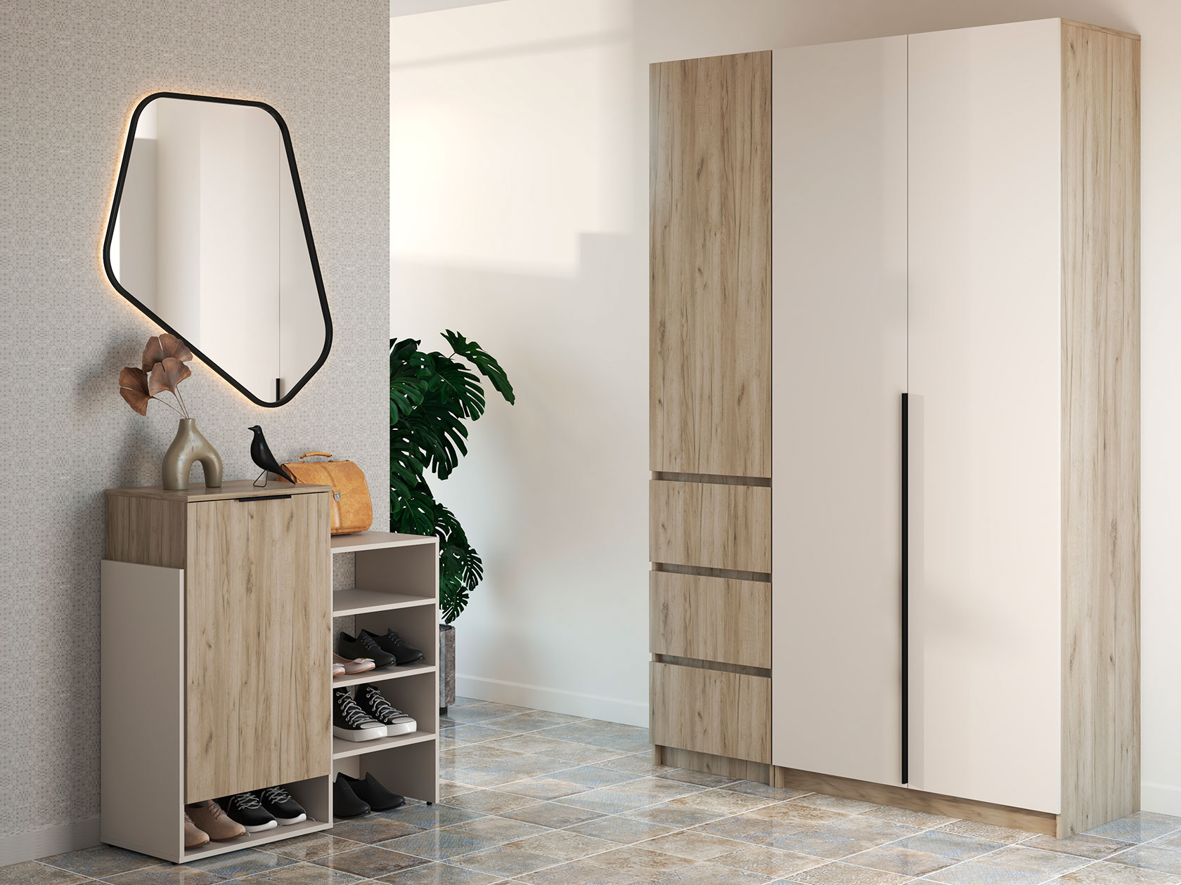 Прихожая Бохо поможет функционально обустроить современную входную зону. Шкафы обеспечат закрытую систему хранения, представленную полками для сложенной одежды и отделением со штангой.