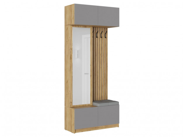 Прихожая Бостон — компактный и практичный вариант размещения верхней одежды и обуви в небольшой комнате. Модель включает несколько отделений за распашными фасадами, удобные крючки, большое зеркало и мягкое сиденье.