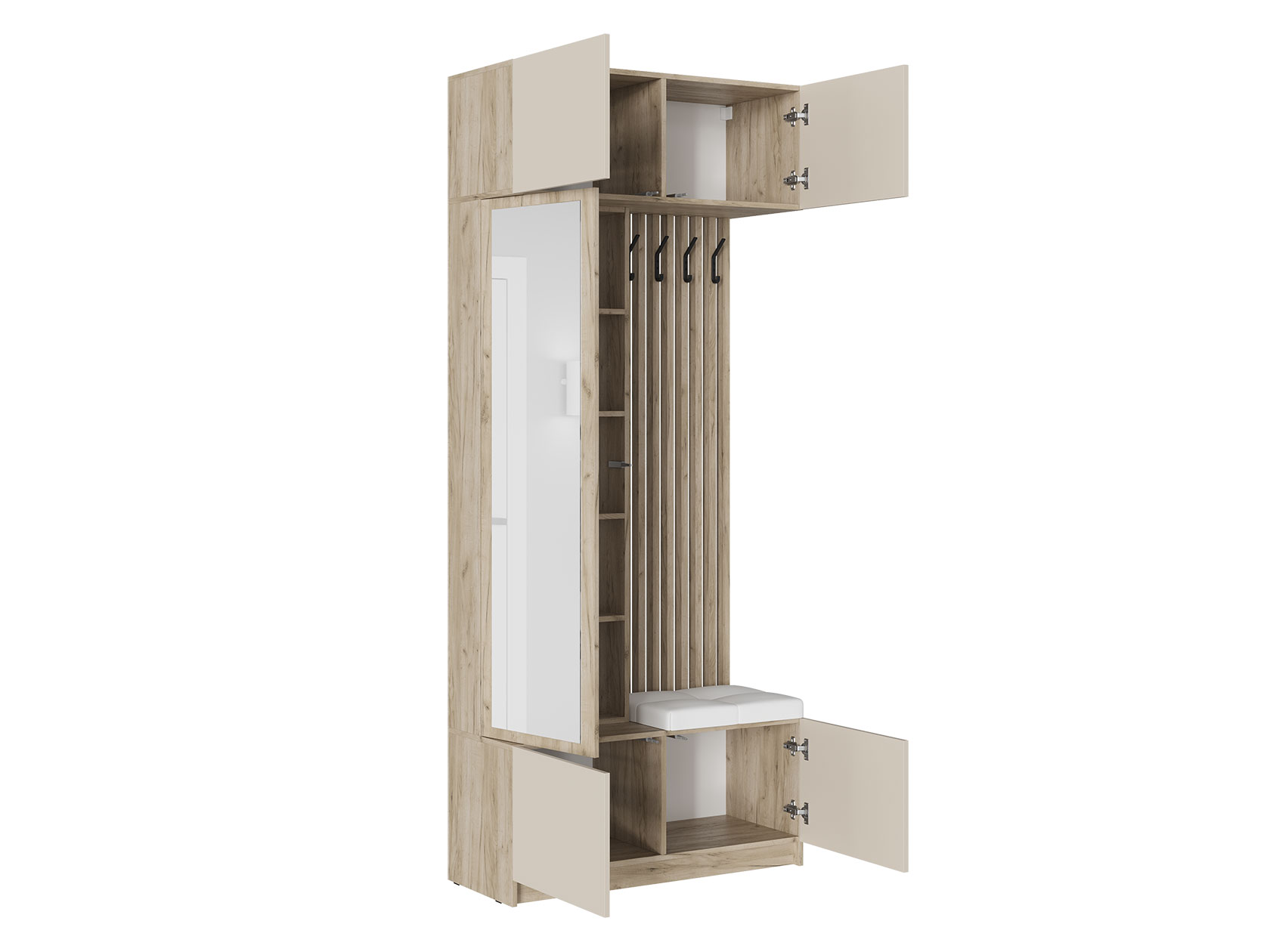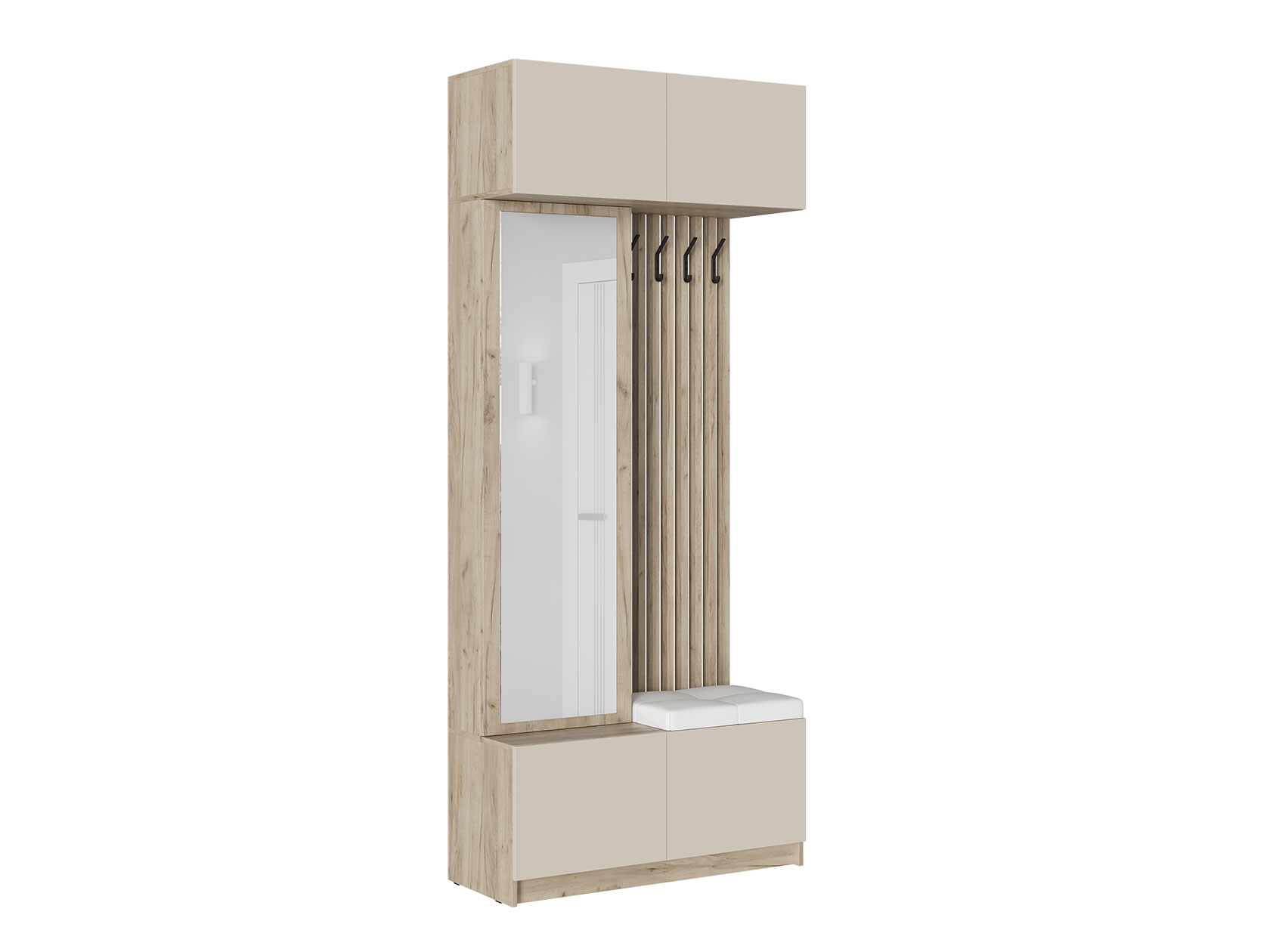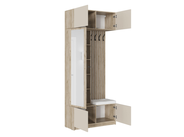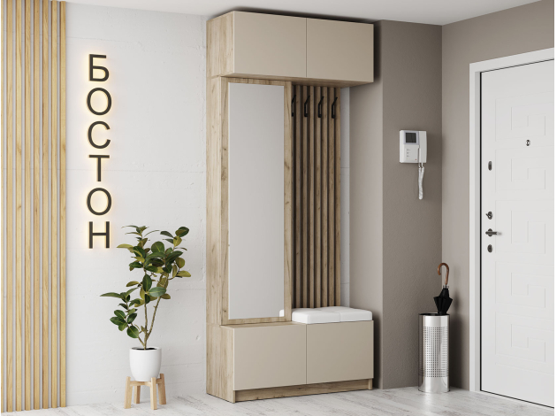 Прихожая Бостон — компактный и практичный вариант размещения верхней одежды и обуви в небольшой комнате. Модель включает несколько отделений за распашными фасадами, удобные крючки, большое зеркало и мягкое сиденье.