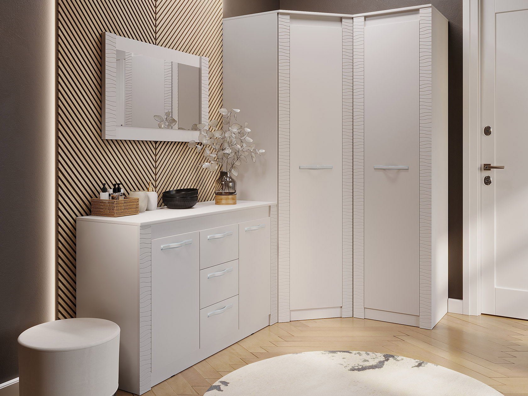 Прихожая Далия создаст красивый и светлый интерьер при входе в квартиру. Практичный набор элементов позволит удобно разместить повседневную и верхнюю одежду, а также обувь и аксессуары. Необычная фрезеровка по краям фасадов создает привлекательные акценты меблировки. Зеркало добавляет пространству света и дает возможность оценить внешний вид перед выходом из дома.