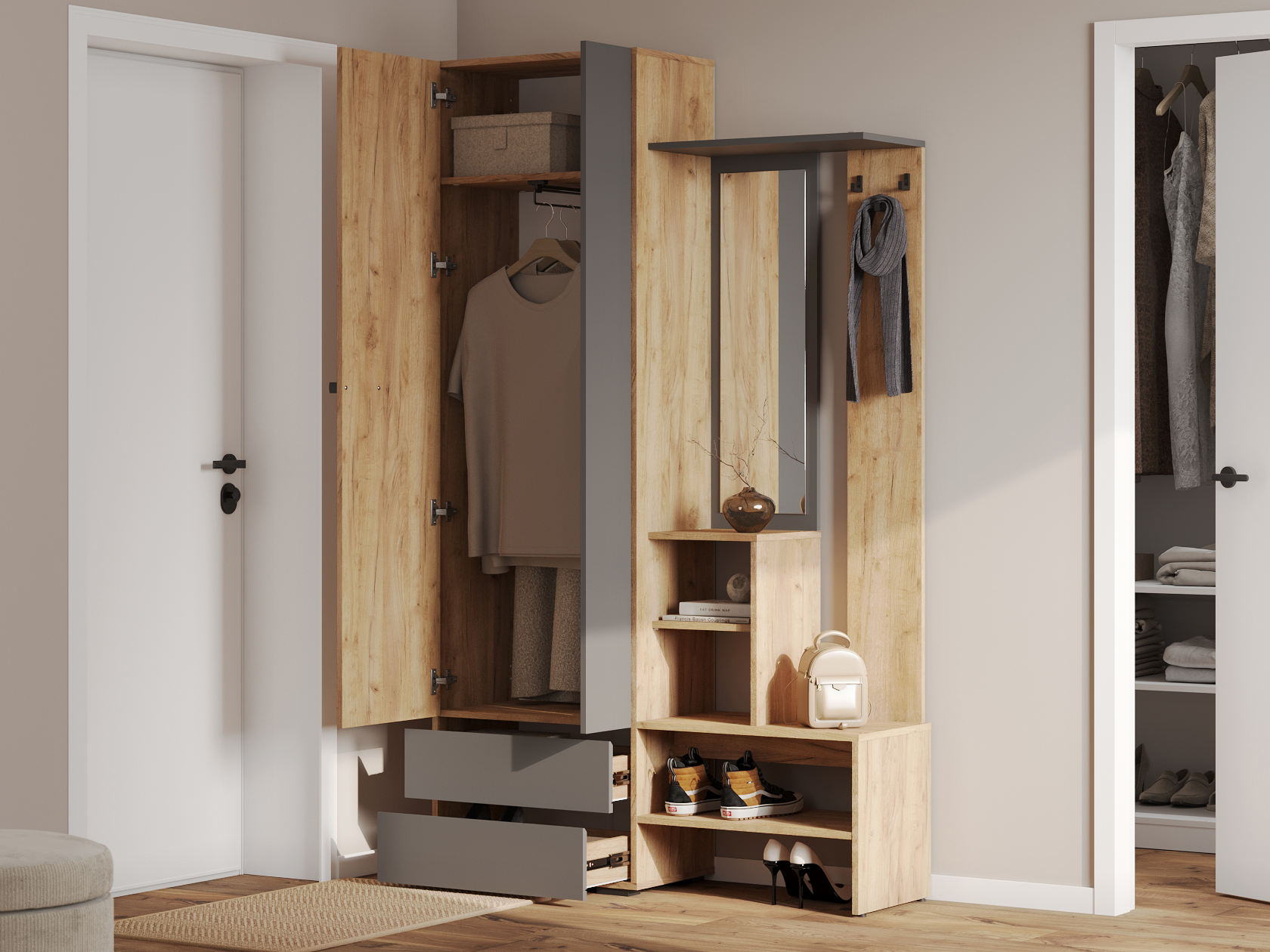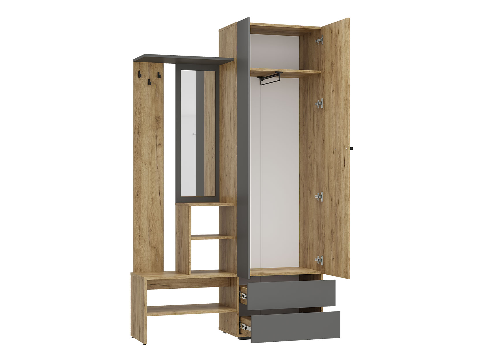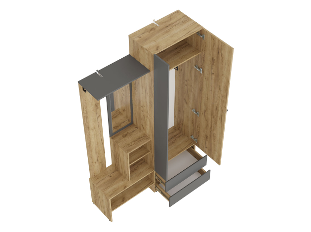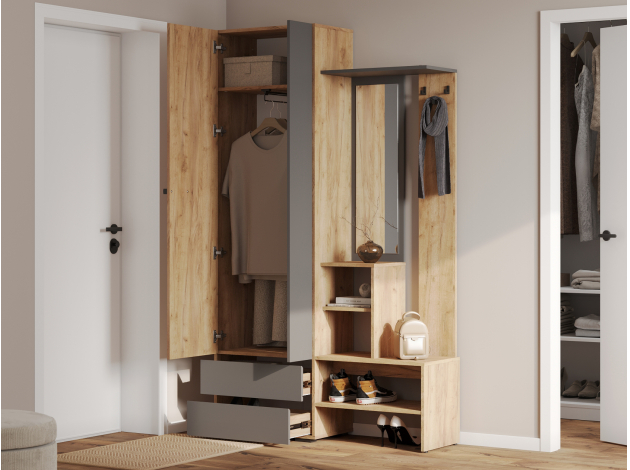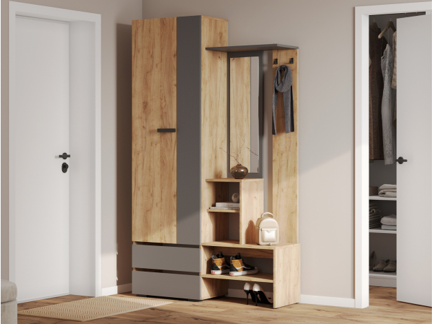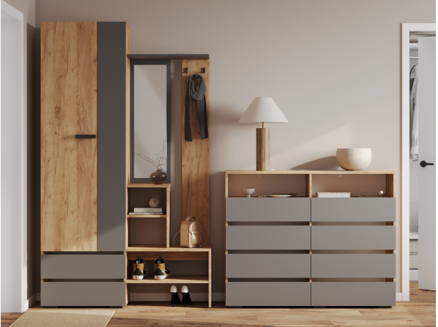 Прихожая Эссо — удобная функциональная модель для хранения верхней и повседневной одежды. Ниша со штангой, открытая вешалка и выдвижные ящики позволяют распределить предметы гардероба и аксессуары так, чтобы легко находить нужную вещь даже в спешке. Гладкий фасад с прямой ручкой поддерживает тренд на минимализм в оформлении интерьера.