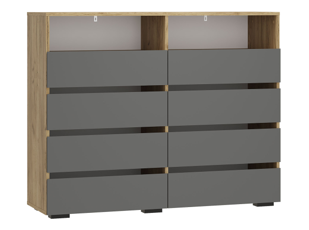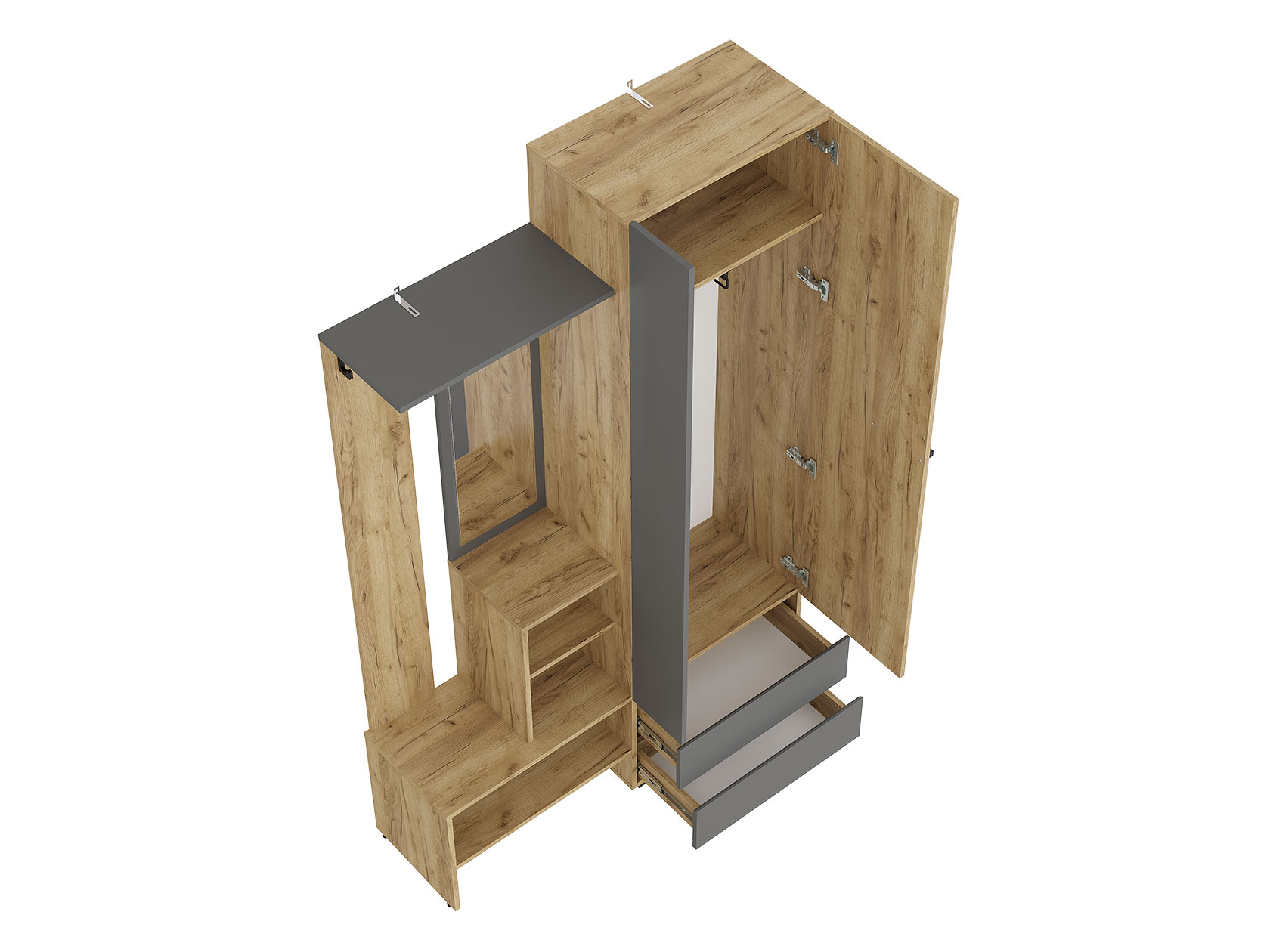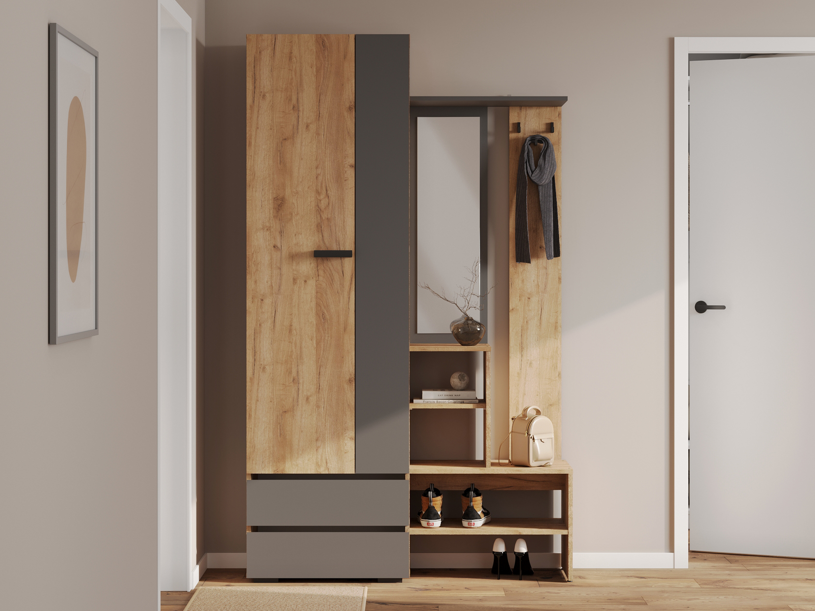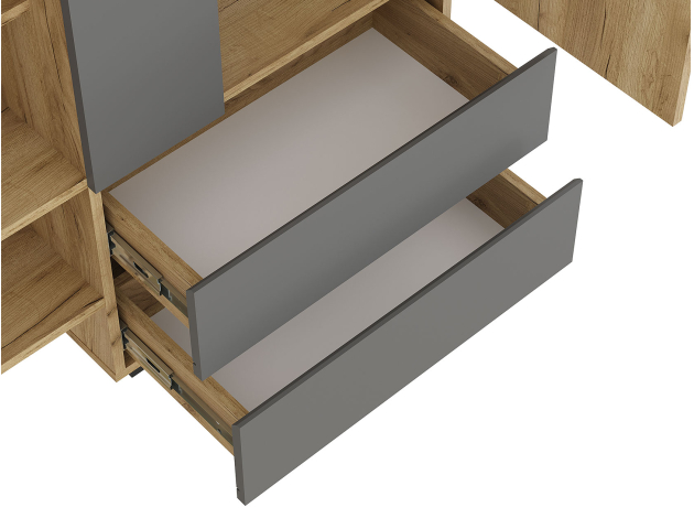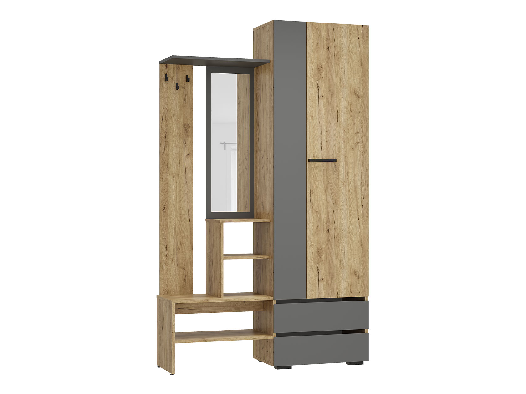 Прихожая Эссо — удобная функциональная модель для хранения верхней и повседневной одежды. Ниша со штангой, открытая вешалка и выдвижные ящики позволяют распределить предметы гардероба и аксессуары так, чтобы легко находить нужную вещь даже в спешке. Гладкий фасад с прямой ручкой поддерживает тренд на минимализм в оформлении интерьера.