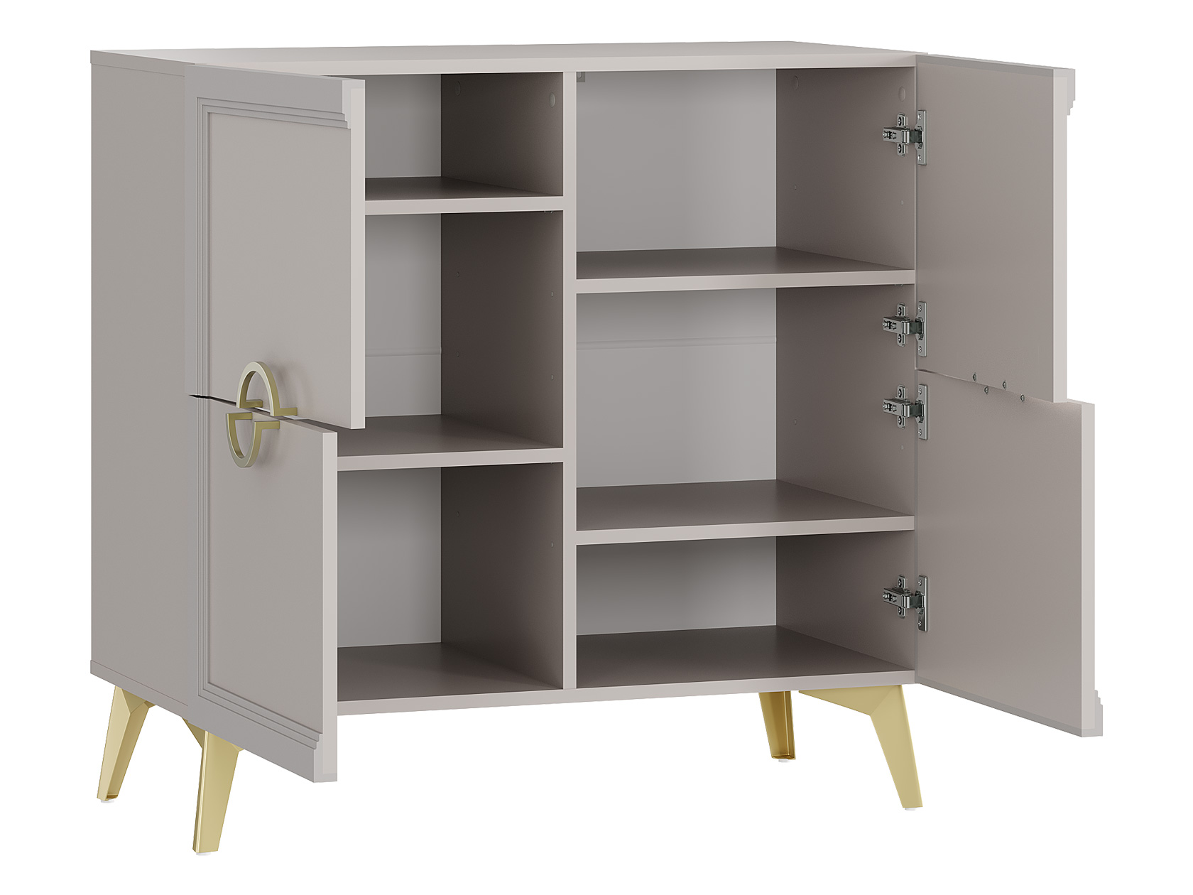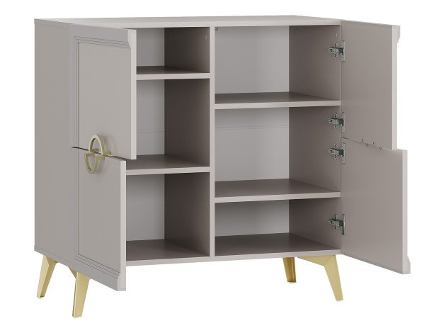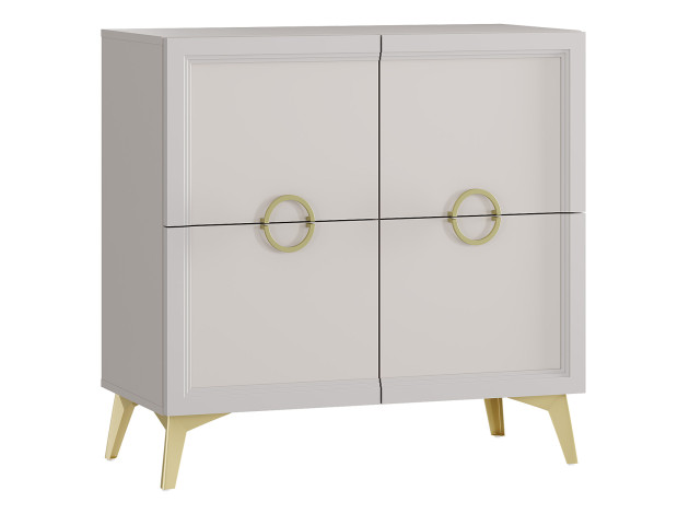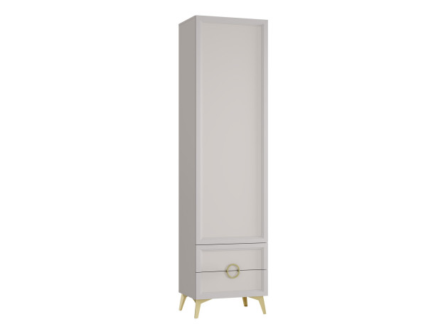 Прихожая Эстетика воплощает современную элегантность и практичный стиль. Высокий шкаф и тумба с распашными дверцами помогают поддерживать порядок при входе в квартиру, аккуратно разместив верхнюю одежду и обувь. Золотистые полукруглые ручки добавляют обстановке утонченности, а изящная рамочная фрезеровка придает пространству глубину.