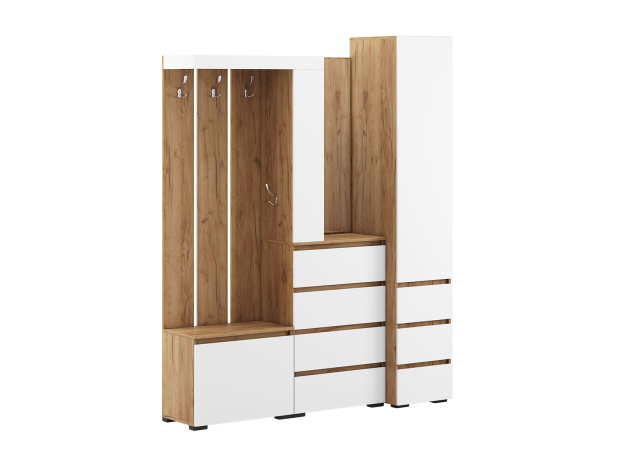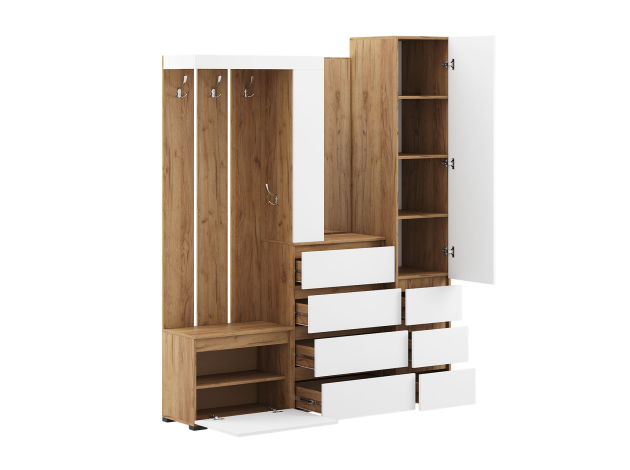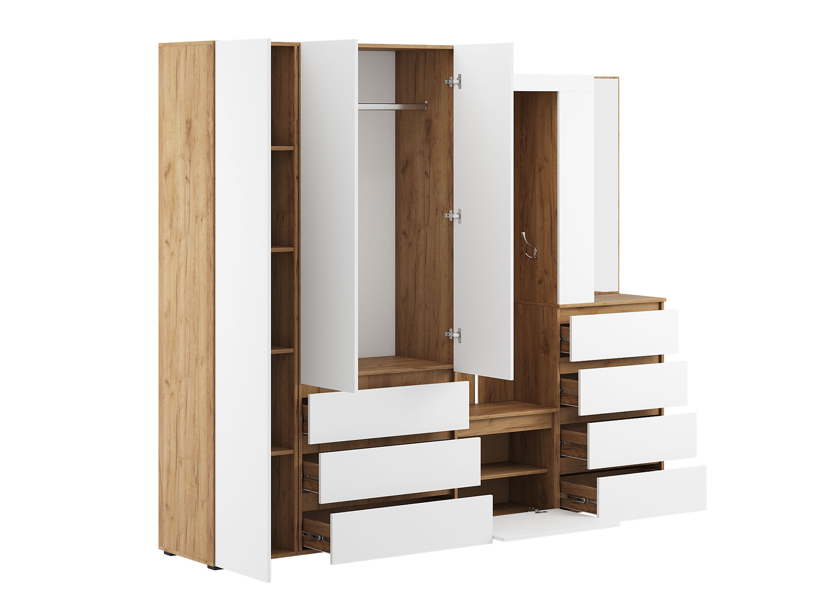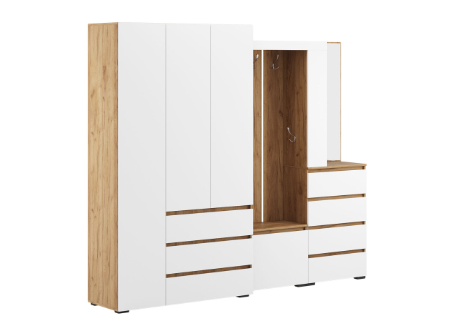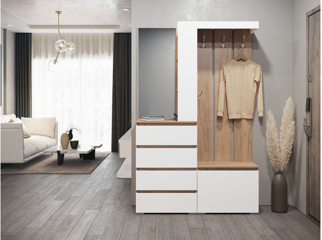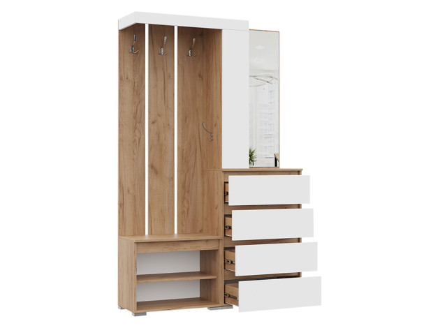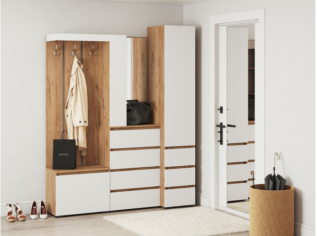 Прихожая Элли — стильный и практичный модуль, в котором продумана каждая деталь. Рядом с зеркалом расположены полочки для косметики, парфюма и аксессуаров, а в ящиках есть место для шарфов, перчаток и ключей. Панель с крючками для верхней одежды дополнена обувницей. Плавный ход ящиков делает прихожую еще удобнее.