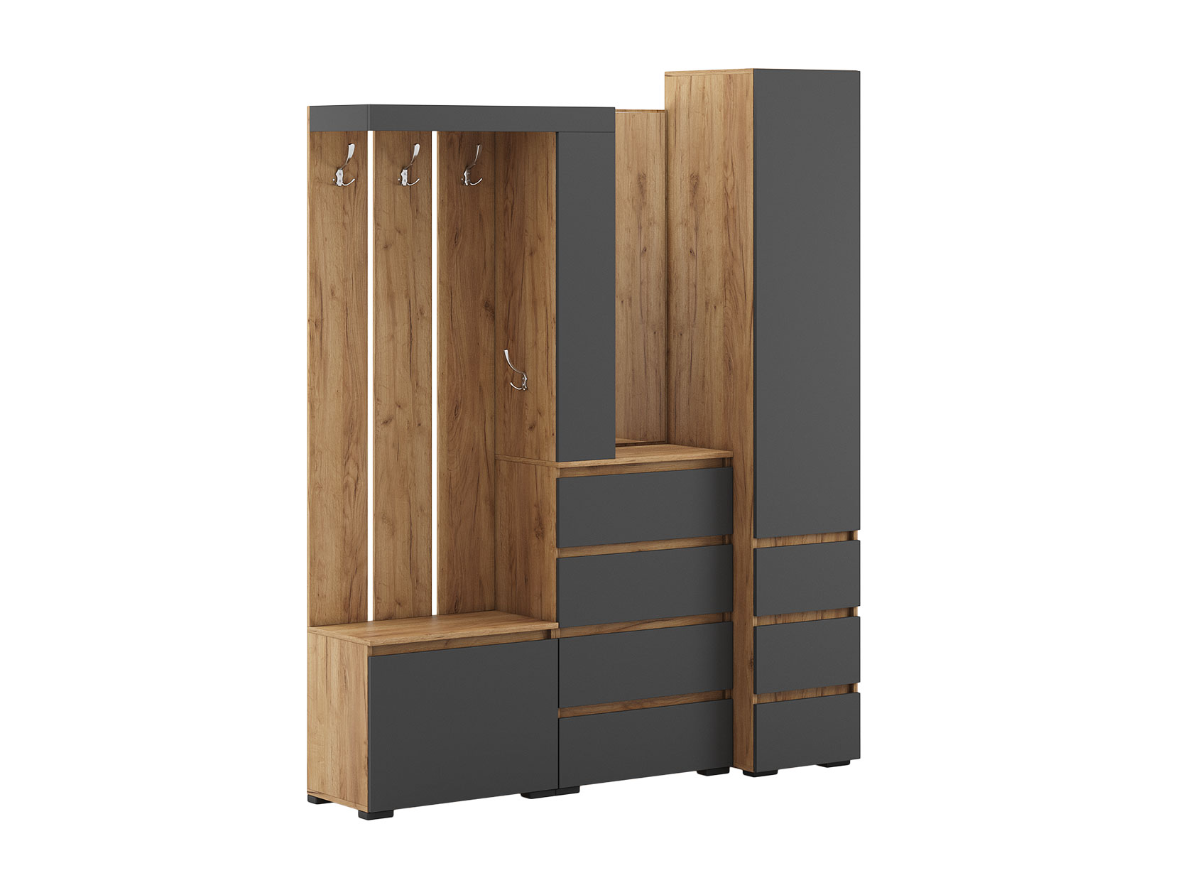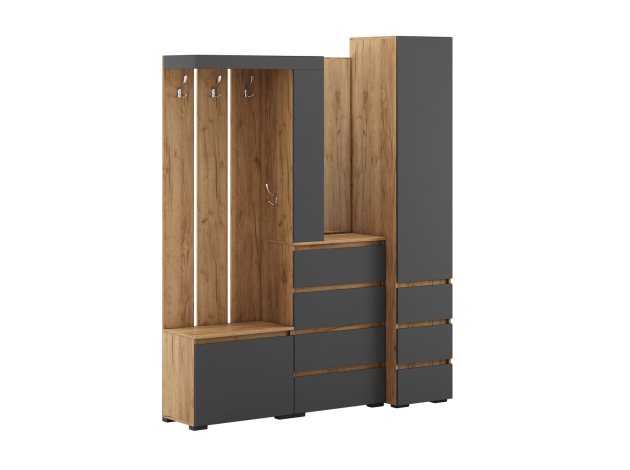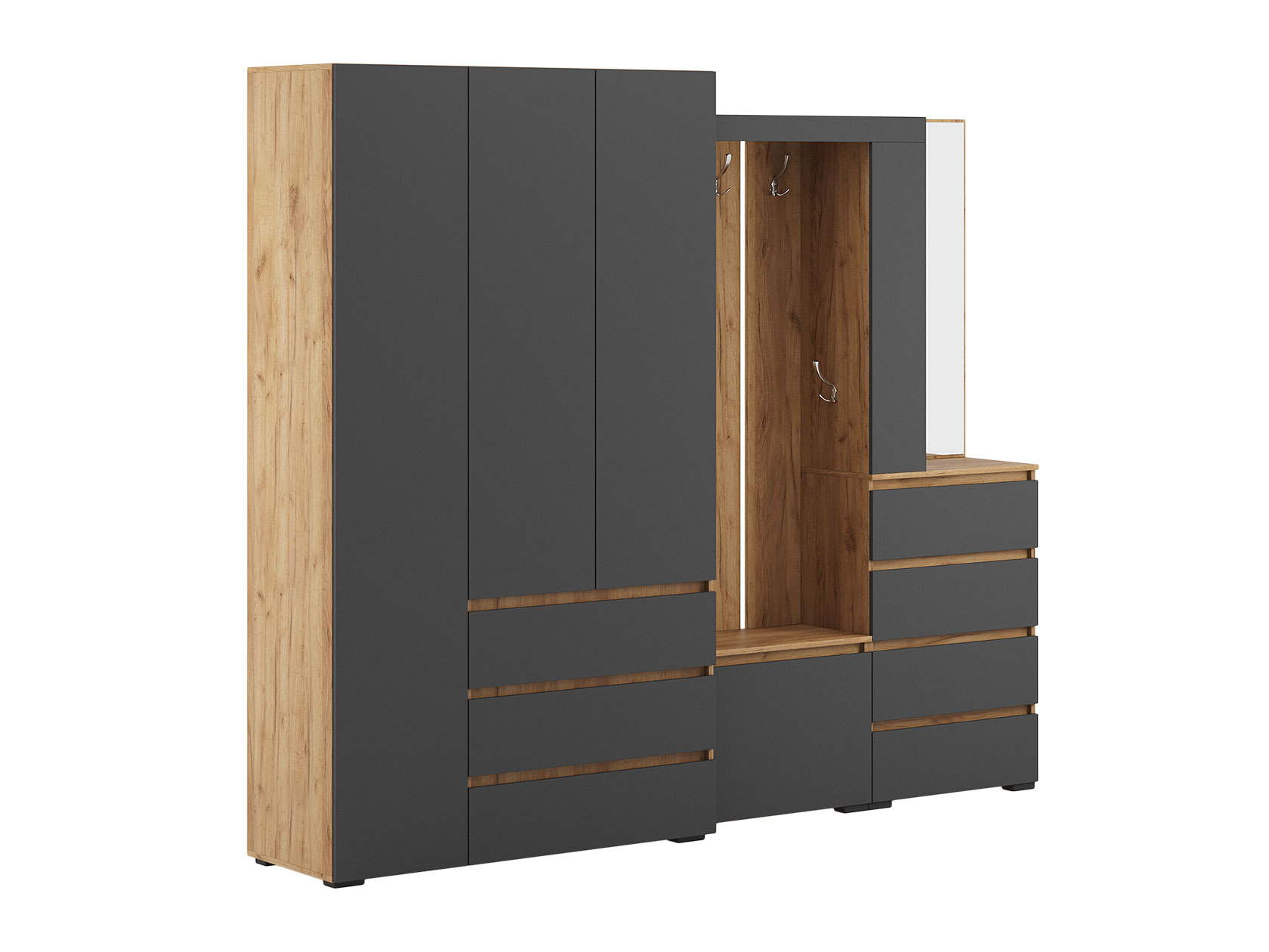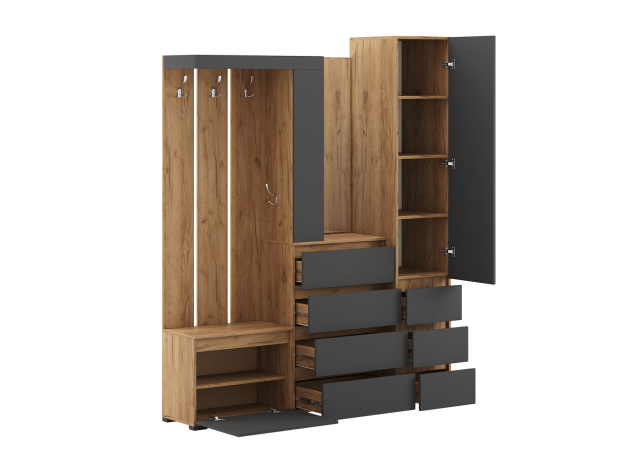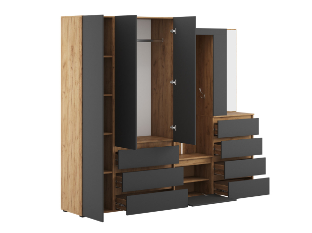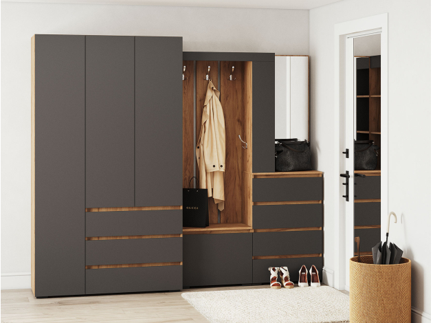 Прихожая Элли — стильный и практичный модуль, в котором продумана каждая деталь. Рядом с зеркалом расположены полочки для косметики, парфюма и аксессуаров, а в ящиках есть место для шарфов, перчаток и ключей. Панель с крючками для верхней одежды дополнена обувницей. Плавный ход ящиков делает прихожую еще удобнее.