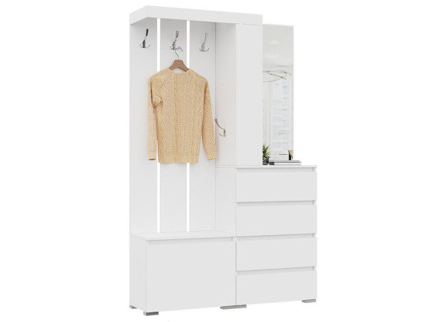 Прихожая Элли Макси обеспечит достаточно места для всех вещей и обуви. Большой шкаф подходит для хранения курток, плащей и коробок. Открытая вешалка с крючками помогает держать под рукой сезонные предметы гардероба. Комод с зеркалом станет завершающим штрихом интерьера, организуя порядок среди важных мелочей. Дверцы и ящики без лицевой фурнитуры открываются легким нажатием на фасад.