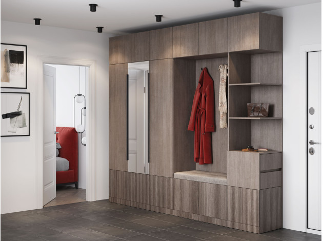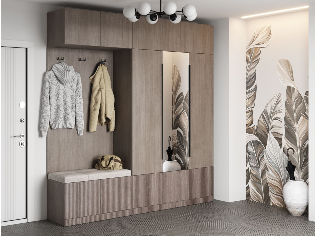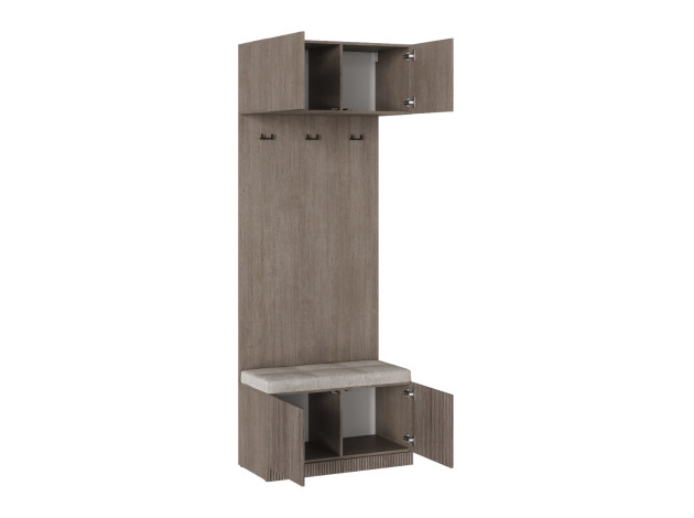 Прихожая Кантри с сиденьем — идеальное решение для небольшой входной зоны. Открытая вешалка поможет рационально разместить верхнюю одежду. Антресольное отделение подойдет для сезонных вещей, а напольная тумба выступит в роли обувницы с мягким сиденьем.
