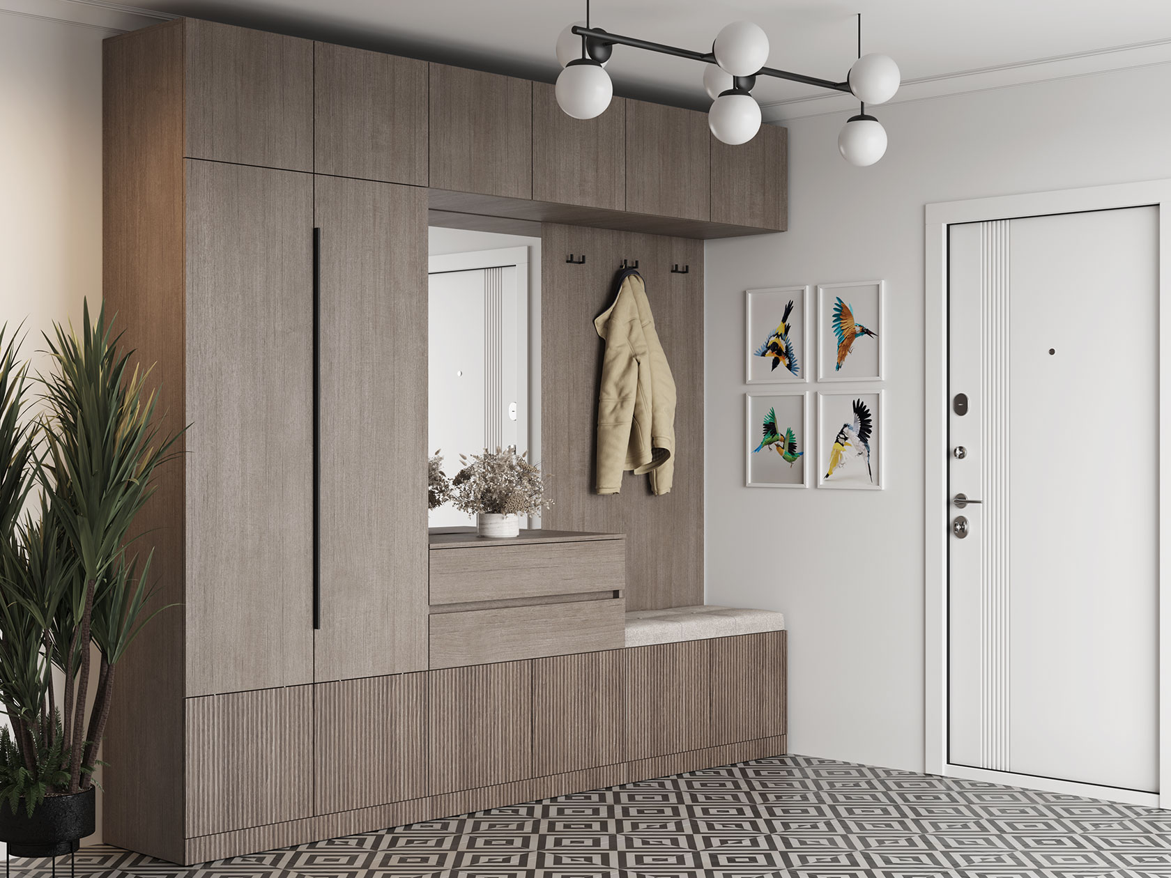 Прихожая Кантри со шкафом — просторный гарнитур для организации порядка во входной зоне. Разнообразие решений для хранения позволяет разместить всю сезонную, повседневную и другую одежду. Мягкая банкетка и прямоугольное зеркало дополняют набор, создавая ощущение уюта.