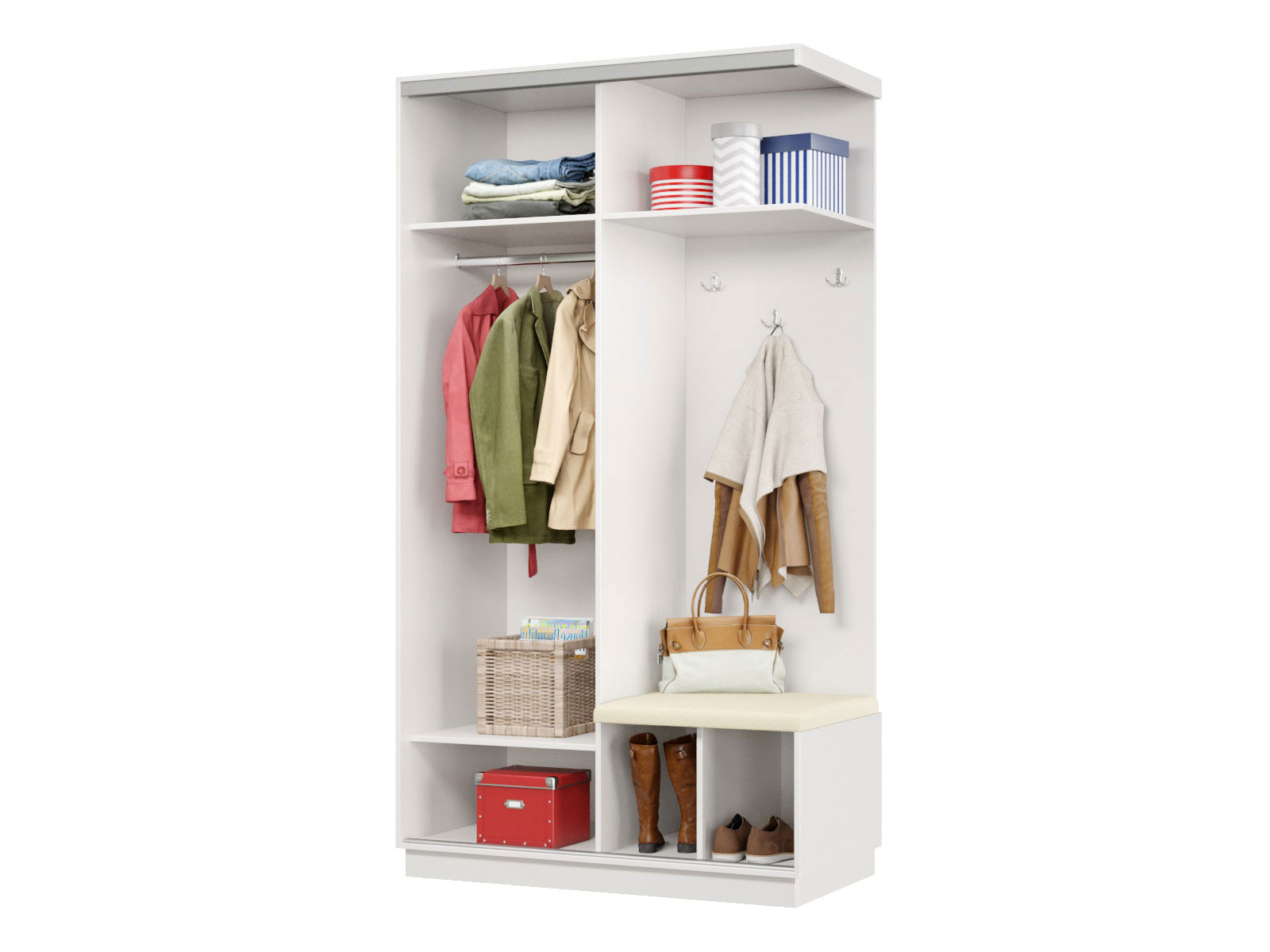 • Прихожая Маршал Лайт — оптимальное решение для создания уютной и функциональной входной зоны. Комбинированная конструкция организует оптимальное хранение всех предметов гардероба: закрытая секция подойдет для сезонной одежды, ниша с крючками позволит держать под рукой повседневные вещи. Мягкое сиденье добавит комфорта при переобувании.