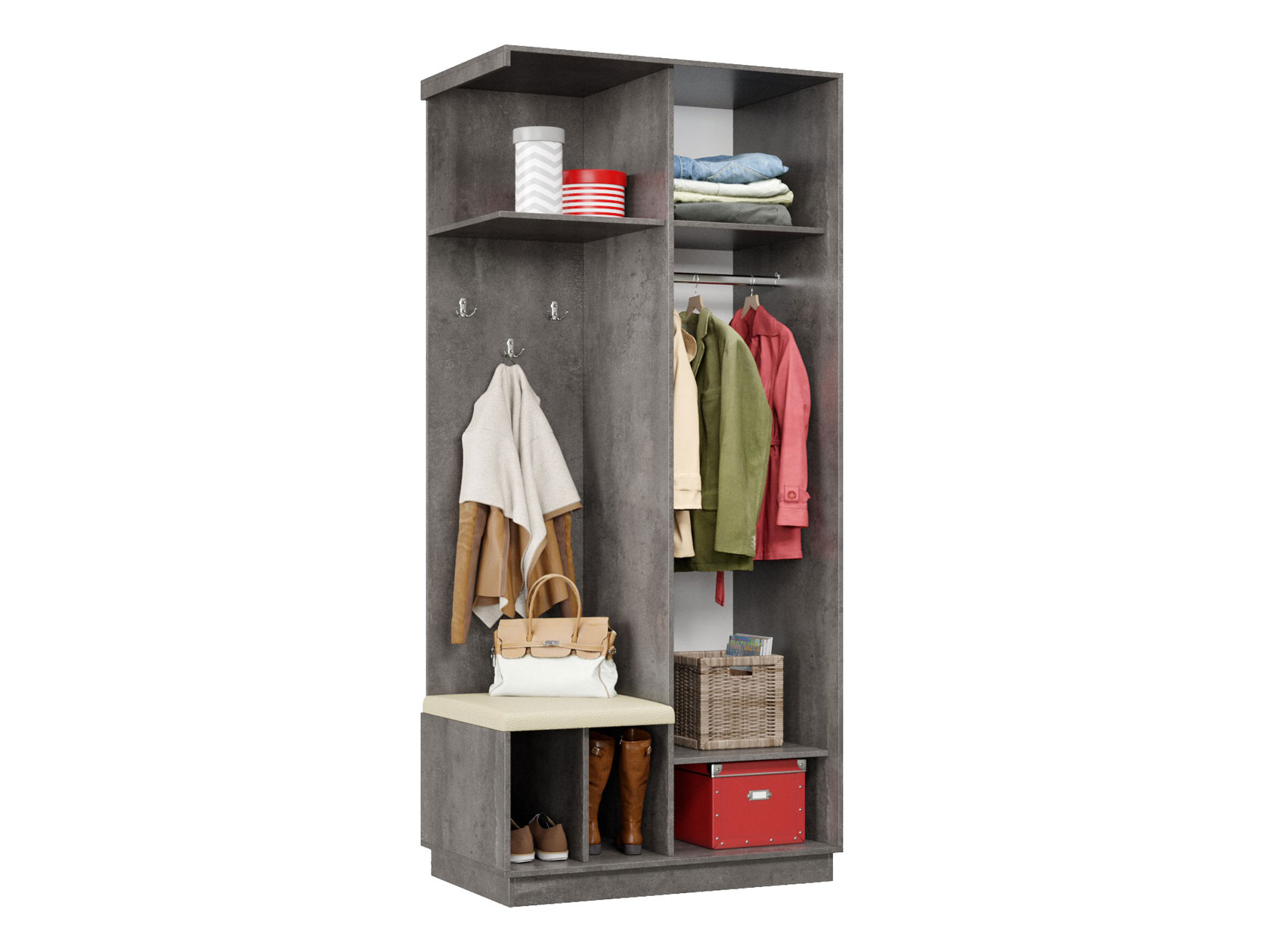 • Прихожая Маршал Лайт — оптимальное решение для создания уютной и функциональной входной зоны. Комбинированная конструкция организует оптимальное хранение всех предметов гардероба: закрытая секция подойдет для сезонной одежды, ниша с крючками позволит держать под рукой повседневные вещи. Мягкое сиденье добавит комфорта при переобувании.
