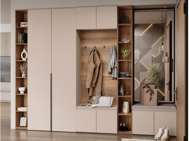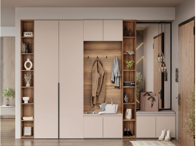 Прихожая Лаура Комбо позволит поддерживать порядок при входе в квартиру. В распашном шкафу находится отделение для хранения сезонной одежды. Напольные тумбы обеспечат место для нескольких пар обуви. Антресольная секция подойдет, чтобы убрать коробки и вещи, которые используются редко. В дизайне акцент сделан на минимализм, что придает мебели аккуратный и современный вид. Панель с текстурой дерева добавляет обстановке нотки теплоты.