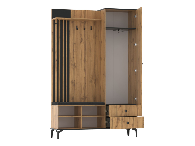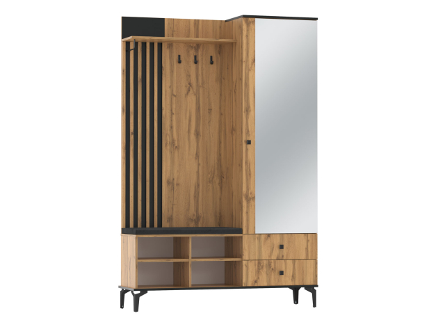Прихожая Либерти — практичное решение для меблировки входной зоны. Панель с крючками организует место для повседневных предметов гардероба, сумок и зонтов. За зеркалом расположена секция с поперечной штангой для удобного хранения верхней и сезонной одежды. Реечный декор, текстура дерева и зеркальный фасад придают обстановке динамичность и уют.