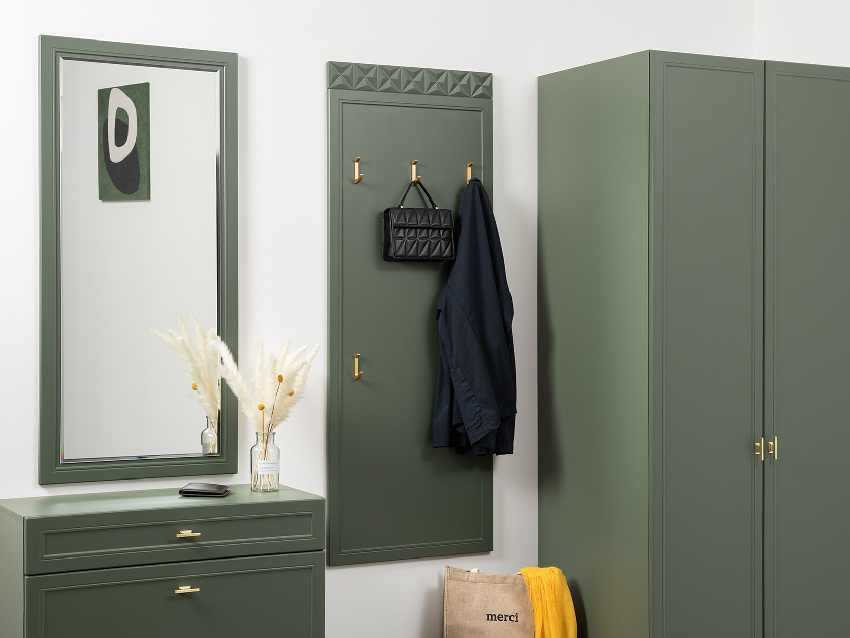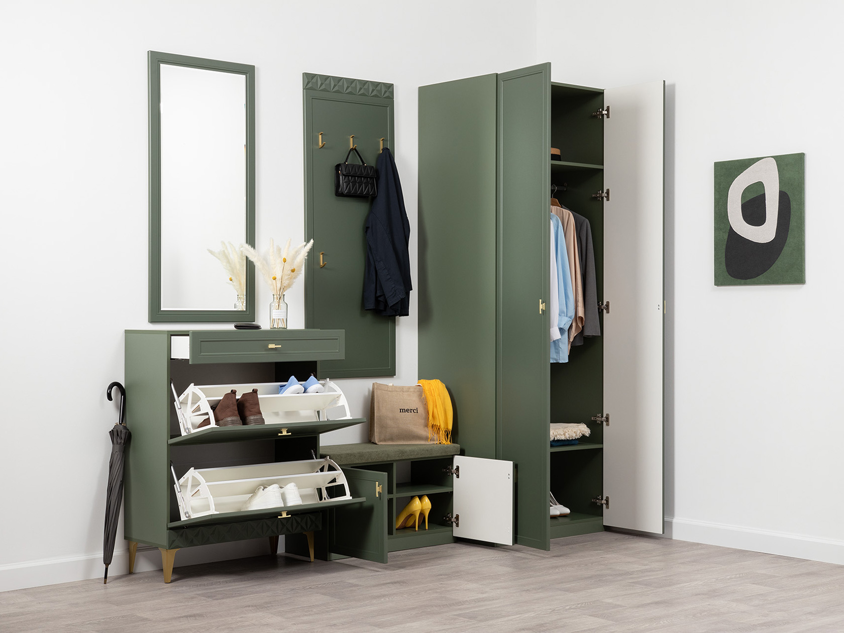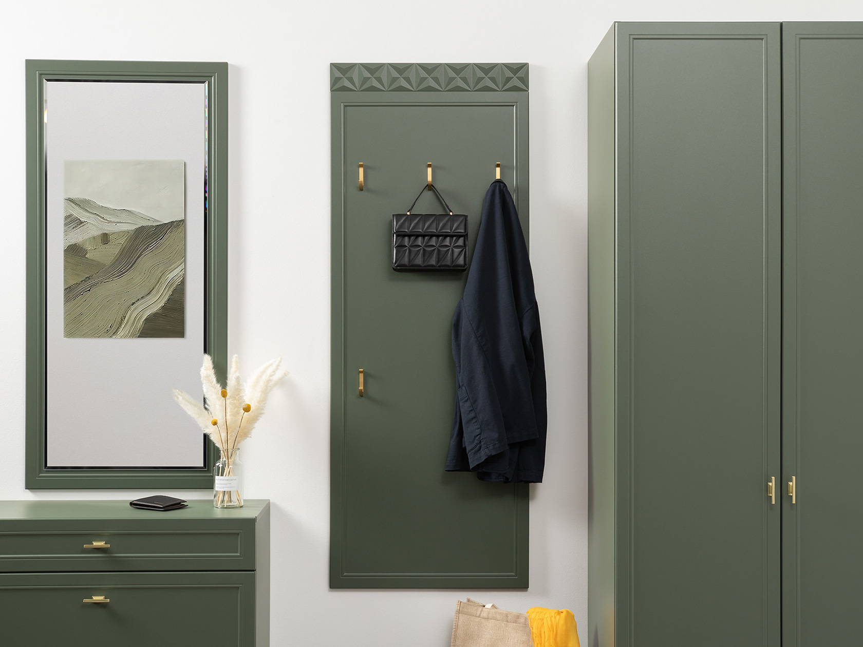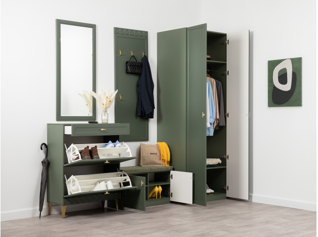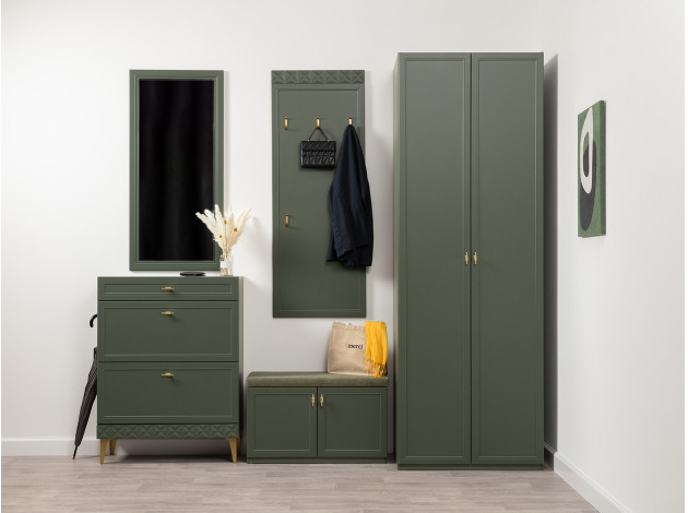 Прихожая Марион Дымчатый зеленый, ЛДСП / Олива шагрень, МДФ / Олива, велюр