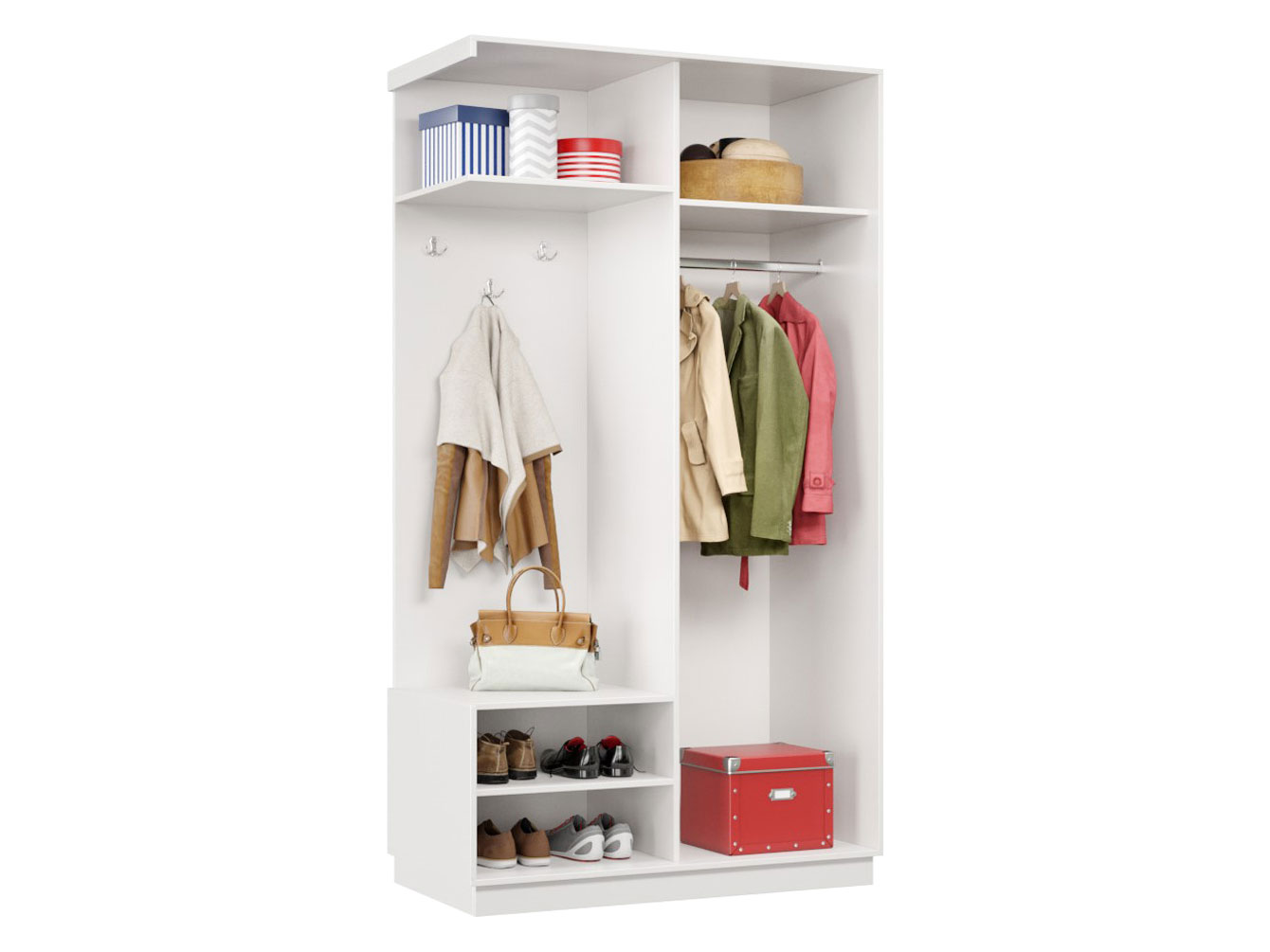 • Прихожая Маршал с открытой вешалкой идеально подходит для небольших помещений. Система хранения предусматривает секцию с крючками для одежды и полками для обуви и головных уборов, а также отделение с раздвижной дверцей для сезонных предметов гардероба. Зеркальный фасад позволит в деталях оценить подобранный образ и визуально расширит пространство.