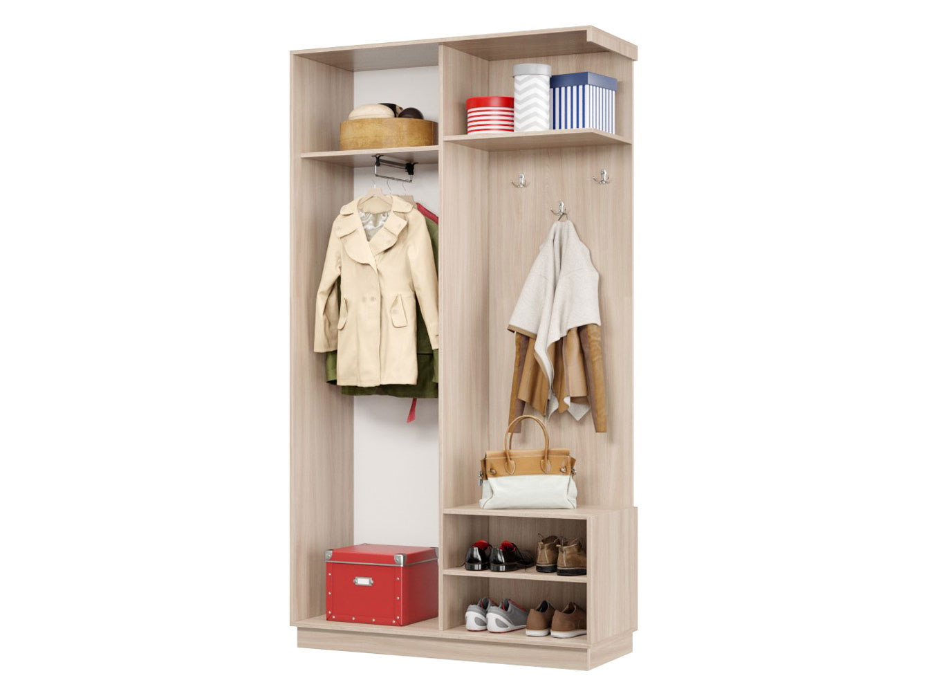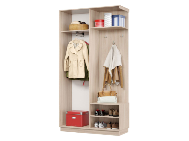 • Прихожая Маршал с открытой вешалкой идеально подходит для небольших помещений. Система хранения предусматривает секцию с крючками для одежды и полками для обуви и головных уборов, а также отделение с раздвижной дверцей для сезонных предметов гардероба. Зеркальный фасад позволит в деталях оценить подобранный образ и визуально расширит пространство.